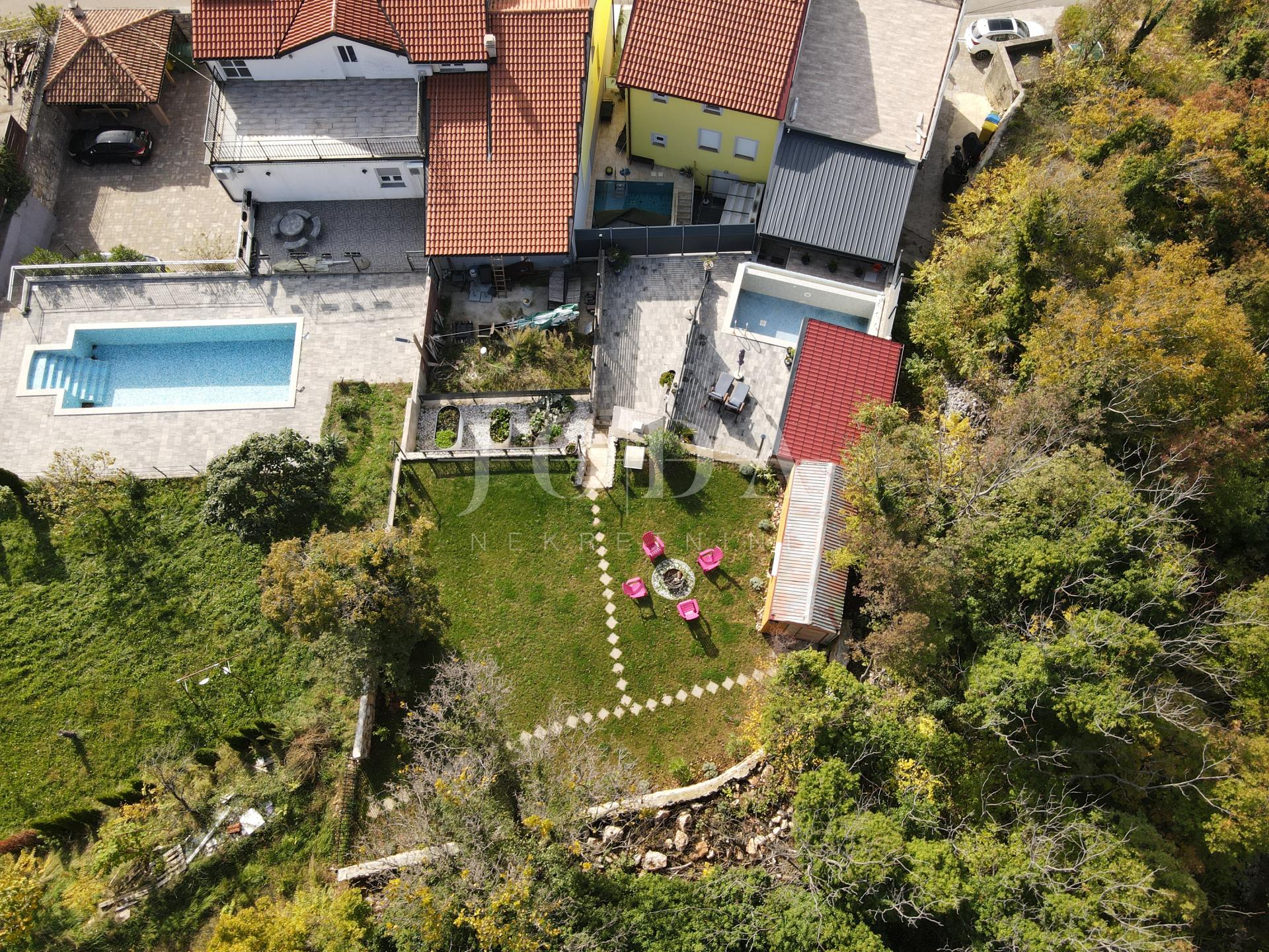 Na kuću se nadovezuje vanjsi prostora za druženje,sa ljetnom kuhinjom,te roštilj,bazen a na samom vrhu kaskadno formirane okućnice je lijepi travnjak sa vrtnom kućicom.