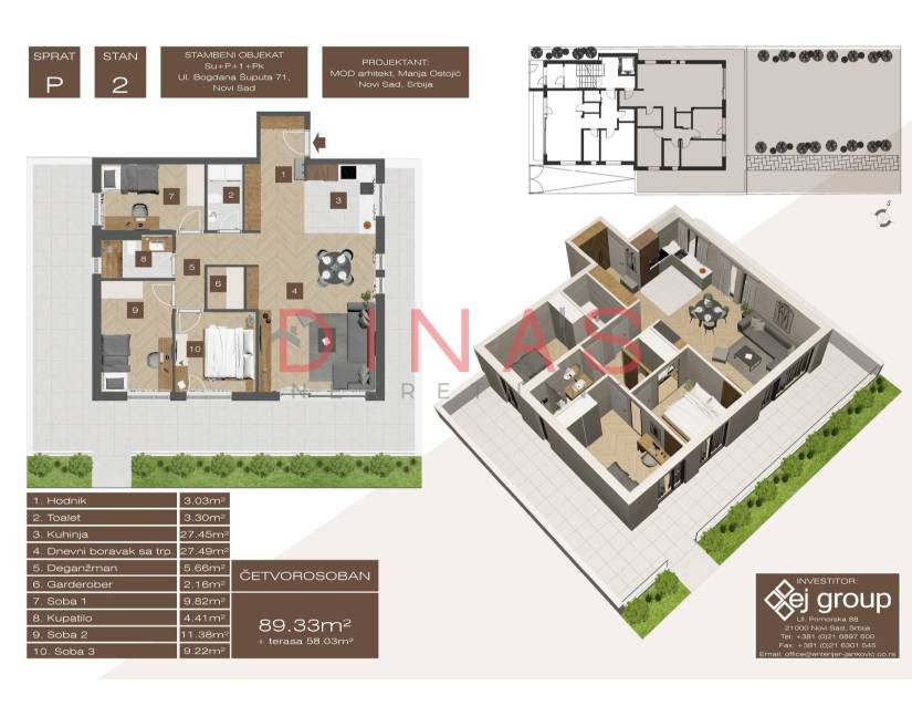 Opis: Na odličnoj lokaciji u Novom Sadu, u ulici Bogdana Šuputa, u neposrednoj blizini Bulevara Patrijarha Pavla, nalazi se odmah useljiv, prostran i moderan četvorosoban stan površine 89 m². Ovaj izuzetno funkcionalan stan odlikuju tri odvojene spavaće sobe, dnevni boravak sa kuhinjom i trpezarijom, garderober, kupatilo, dodatni toalet, kao i prostrana terasa površine 58 m², koja pruža savršeno mesto za odmor i uživanje na otvorenom.