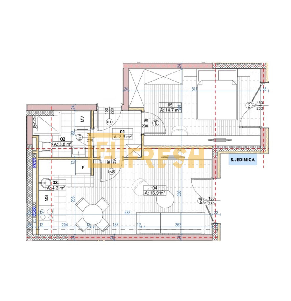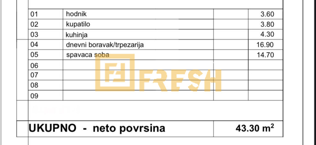 Opis: Jednosoban stan površine 43.30m2 dostupan na više spratova stambene zgrade u izgradnji pod Ljubović, Podgorica.
