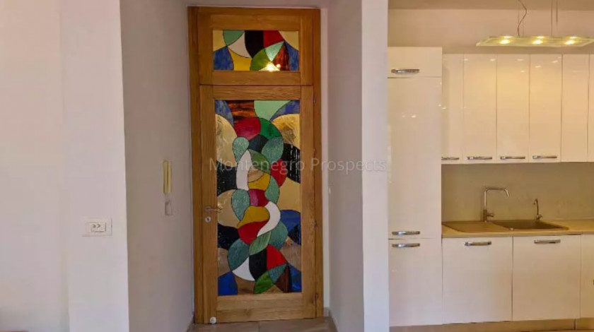 Enterijer je pažljivo osmišljen i dekorisan — sa dekorativnom rasvjetom, vitraž staklom na unutrašnjim vratima, atraktivnim zidnim tapetama i ugradnim ormarima.