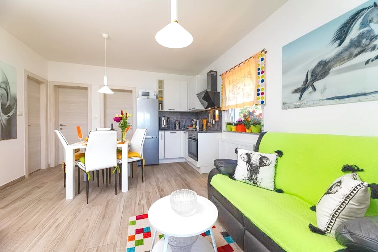 U kvalitetno izgrađenom objektu, apartman je smješten na 2. etaži. Apartman obuhvaća ukupnu površinu od približno 47 m2. Na navedenoj površini se nalaze ulazni prostor, dnevni boravak i kuhinja s blagovaonicom, 2 spavaće sobe, kupaonica i lođa. Odlično održavana unutrašnjost nekretnine je u potpunosti uređena kvalitetnim namještajem i svom potrebnom tehničkom opremom.