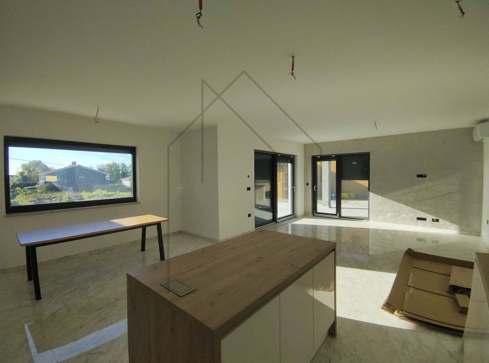 Opis: Ova moderna kuća s bazenom kod Labina, Istra smještena je na ugodnoj rezidencijalnoj poziciji, oko 5 km od Labina i na 10-ak minuta vožnje od turističkog bisera istočne Istre – Rapca i njegovih preko 4,5 km uređenih šljunčanih plaža. Lokalitet spaja prednosti mirnog života u prirodi s dostupnošću svih potrebnih sadržaja: pošta, trgovina, caffe bar i škola nalaze se na pješačkoj udaljenosti. Ljubitelji aktivnog odmora uživat će u neposrednoj blizini pješačkih i šumskih staza, savršenih za biciklizam i šetnje. Kuća je projektirana s naglaskom na funkcionalnost i suvremeni dizajn, prostirući se na dvije etaže. Trenutno je u fazi uređenja i namještanja. Svaka soba ima klima uređaj za grijanje/hlađenje, te je kroz objekt provedeno i podno grijanje. PRIZEMLJE (Dnevna zona):