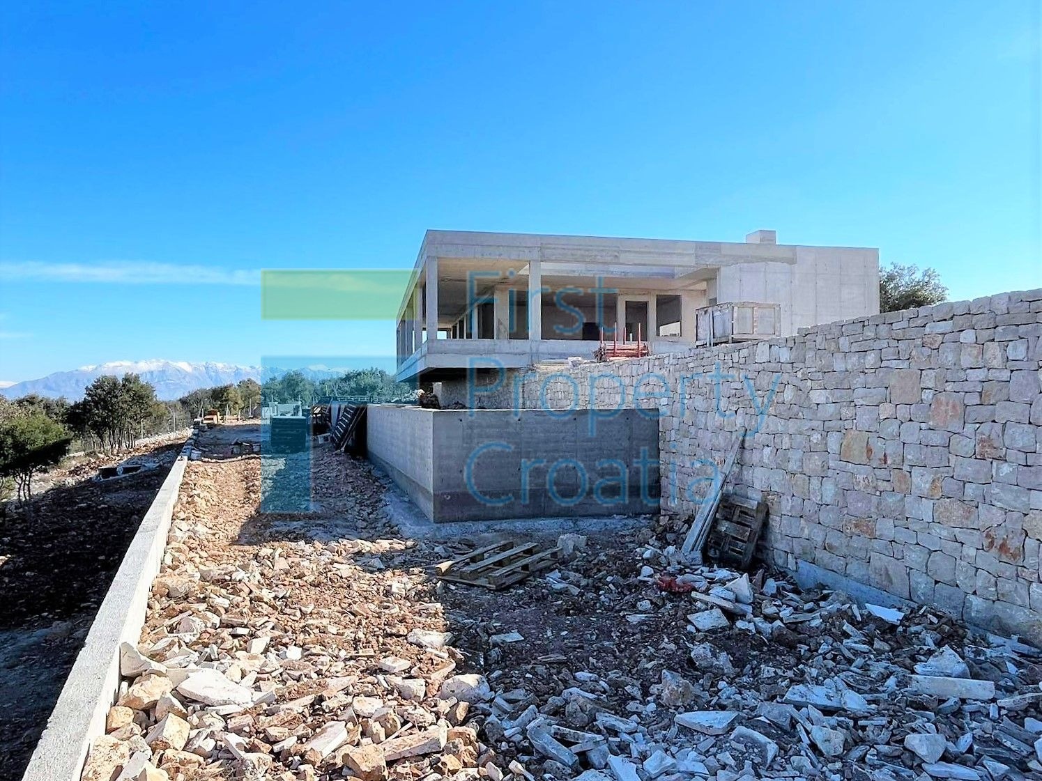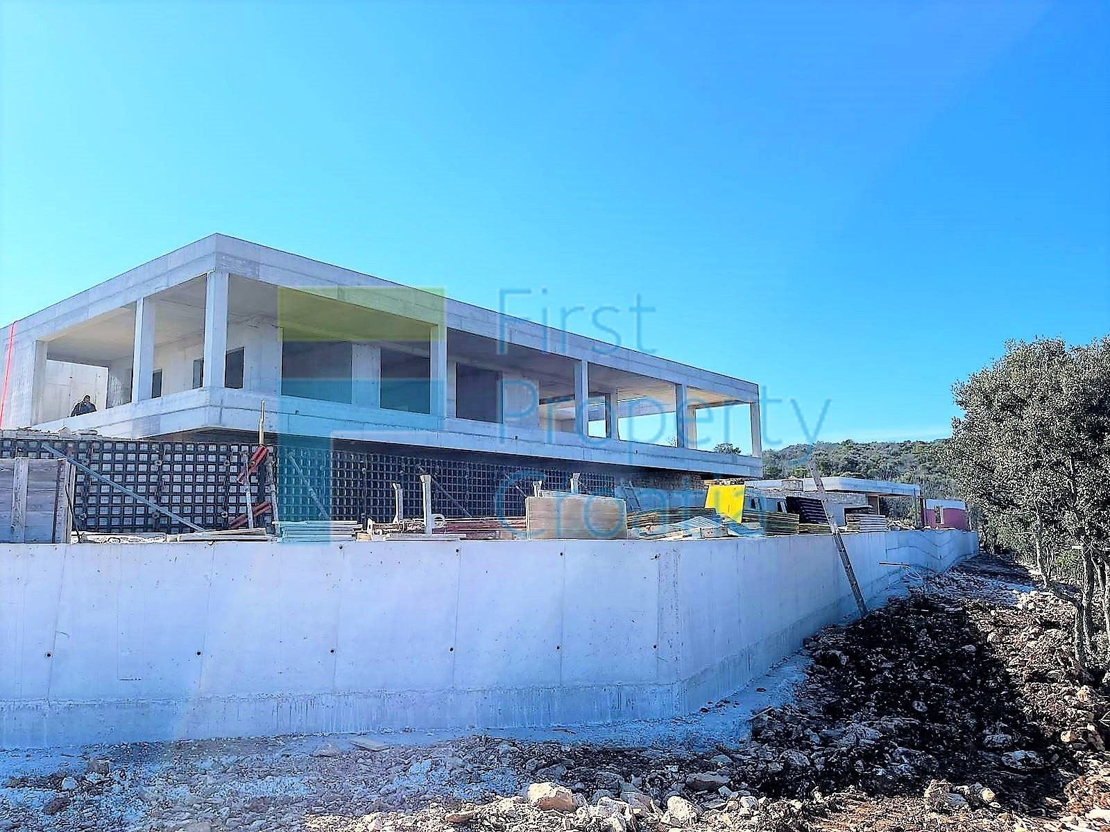 Predmetna nekretnina je u biti projekt izgradnje 2 rezidencije zatvorene zemljišne parcele veličine cca. 11.360m2. Kao što je spomenuto, parcela je omeđena (od suhozida sa 2 ulazna vrata) i započeta je gradnja obje vile, što znači da je projekt u cjelini u roh-bau stanju sa završenim granatiranjem i fasadnim zidanjem. Projekt se nudi u postojećem stanju izgradnje. Na budućem je vlasniku da preuzme proces uređenja i oblikuje ovo veliko imanje prema svojim željama i željama. Što se tiče građevinskih površina, ovaj projekt uključuje: