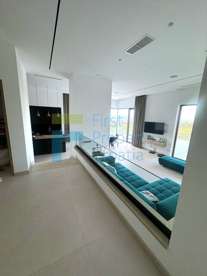 Raspon cca. 307m2 neto površine, vila je smještena na prostranoj parceli od 1.130m2. Prostor vile podijeljen je na 2 etaže povezane unutarnjim stubištem s glavnim ulazom na kat. Prizemlje uključuje 2 spavaće sobe, kupaonicu, wc, hodnik, strojarnicu, kućno kino, kućnu teretanu s vlastitom kupaonicom i wellness zonu s grijanim bazenom i saunom. Obje spavaće sobe izlaze na šarmantnu natkrivenu terasu koja vodi u prostrano dvorište. Na prvom katu ćete pronaći 2 spavaće sobe (od kojih je jedna s vlastitom kupaonicom i ima malu privatnu terasu), predsoblje, predsoblje, wc, praonicu rublja, spremište, malu garderobu i prostrani otvoreni dnevni boravak, kuhinja i blagovaonica. Velika klizna staklena vrata neprimjetno povezuju životni prostor s prostranom terasom s koje se pruža pogled koji oduzima dah....