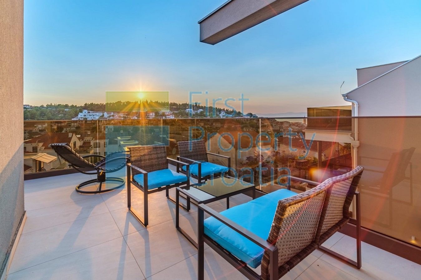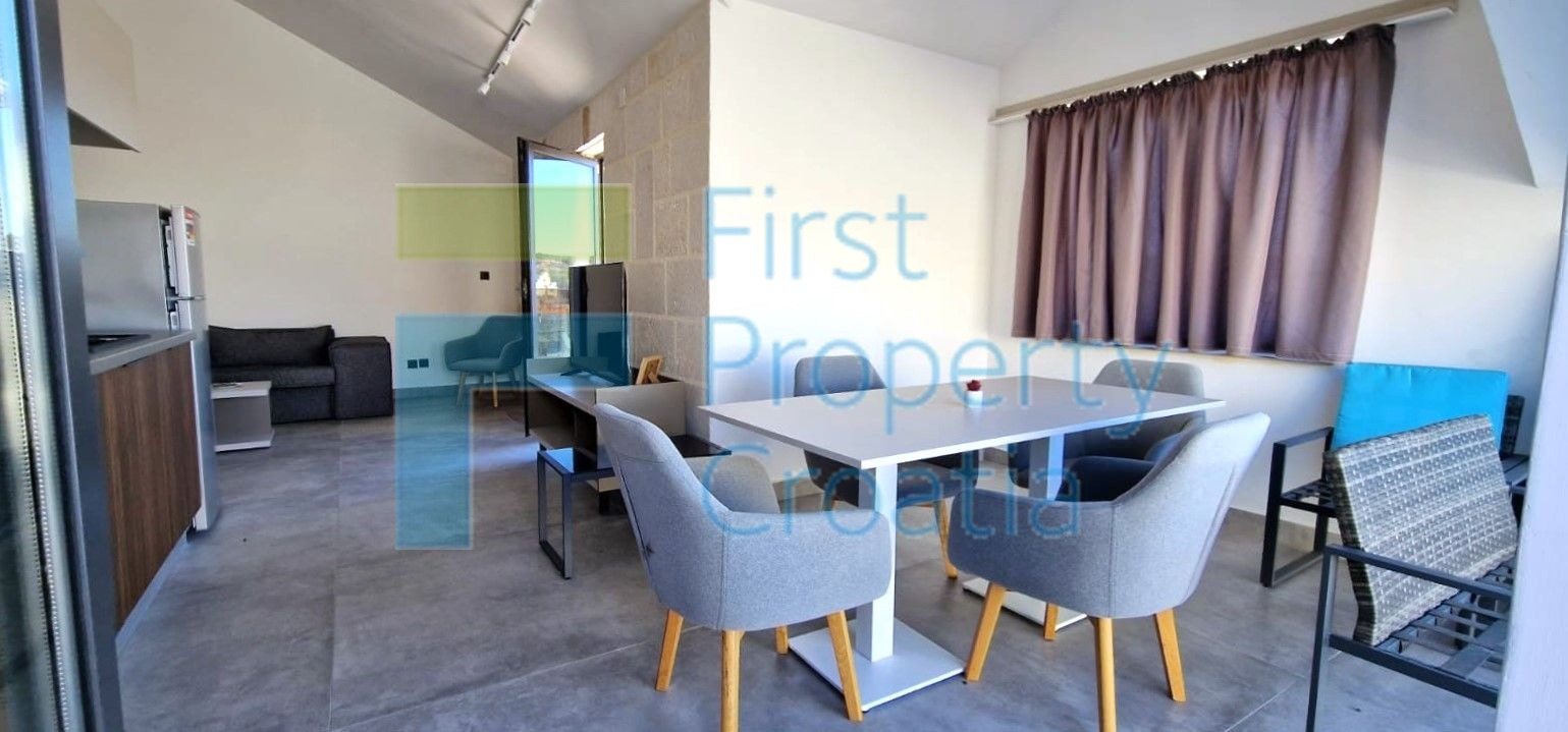 Ova stambena jedinica nalazi se na posljednjem, drugom katu stambene zgrade dovršene 2023. godine. Cijela mikrolokacija zapravo je potpuno nova stambena zajednica jer je zgrada sastavni dio većeg stambenog kompleksa, pružajući svježe i živahno životno okruženje. Lijepa lokalna plaža udaljena je samo 8 minuta šetnje ili 2 minute vožnje, a svakodnevne obveze olakšavaju blizina sadržaja kao što su trgovine, restorani i ljekarna.Stan ima ukupnu korisnu površinu od cca. 86m2, uključujući 77m2 unutarnjeg prostora i 2 prostrane terase od 23m2 i 12m2. Dnevni boravak otvorenog koncepta sastoji se od kuhinje, blagovaonice te svijetlog i prozračnog dnevnog boravka koji izlazi na prostrane terase s kojih se pruža prekrasan pogled na naselje i more. Ova suvremena rezidencija također uključuje 2 spavaće sobe, od kojih jedna ima jedinstveni potkrovlje, 2 kupaonice, hodnik i ulazni prostor. Elegantno namješten, opremljen i klimatiziran, ovaj stan je odmah useljiv. Svojoj privlačnosti pridonosi vanjsko parkirno mjesto koje je prikladno smješteno ispred zgrade....
