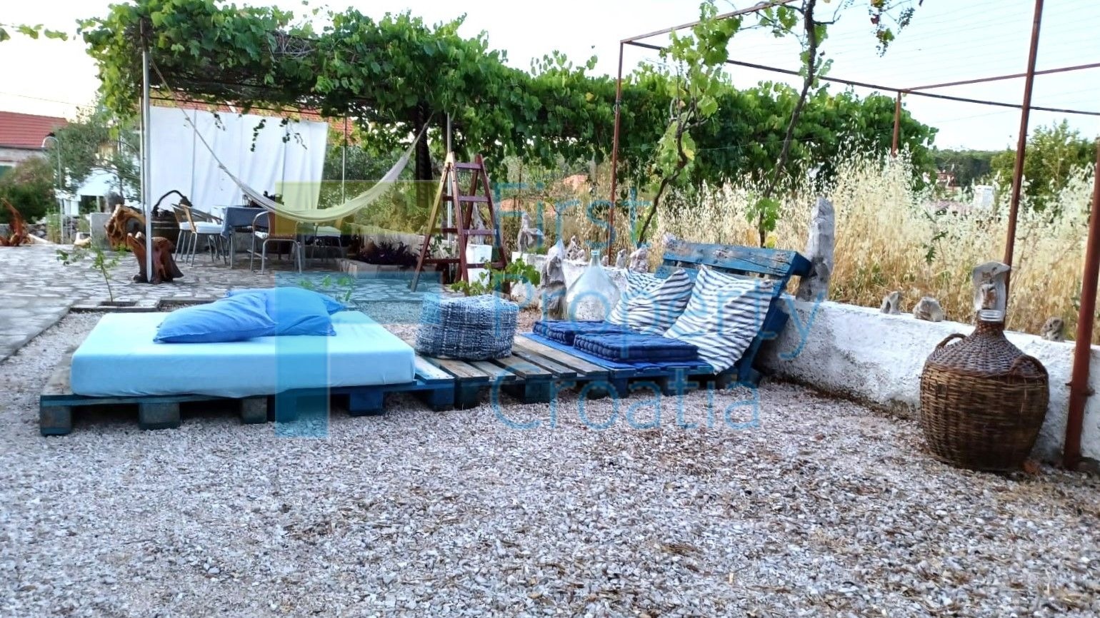 Kuća ima cca. 247m2 bruto površine raspoređene na 2 etaže, na svakoj etaži po jedan kompletno opremljen stan odgovarajućeg rasporeda. Kuća se nalazi na prostranoj parceli od cca. 830m2, pružajući dovoljno prostora za udoban život u zatvorenom prostoru i uživanje na otvorenom. Parking je osiguran na susjednoj parceli od 60m2, u lijepoj hladovini bujnog mediteranskog zelenila. Svaki apartman uključuje predsoblje, 2 spavaće sobe, kupaonicu i otvoreni dnevni boravak, kuhinju i blagovaonicu. Apartman na prvom katu ima prostrani djelomično natkriveni balkon, dok se stan u prizemlju otvara na šarmantnu terasu s natkrivenim prostorom idealnim za obiteljske obroke na otvorenom ili jutarnje pauze za kavu u mirnom okruženju. Iza glavne kuće, na prostranoj parceli nalaze se 2 pomoćne zgrade (od oko 30m2), u kojima se nalazi tradicionalna dalmatinska konoba i ljetna kuhinja s kaminom....
