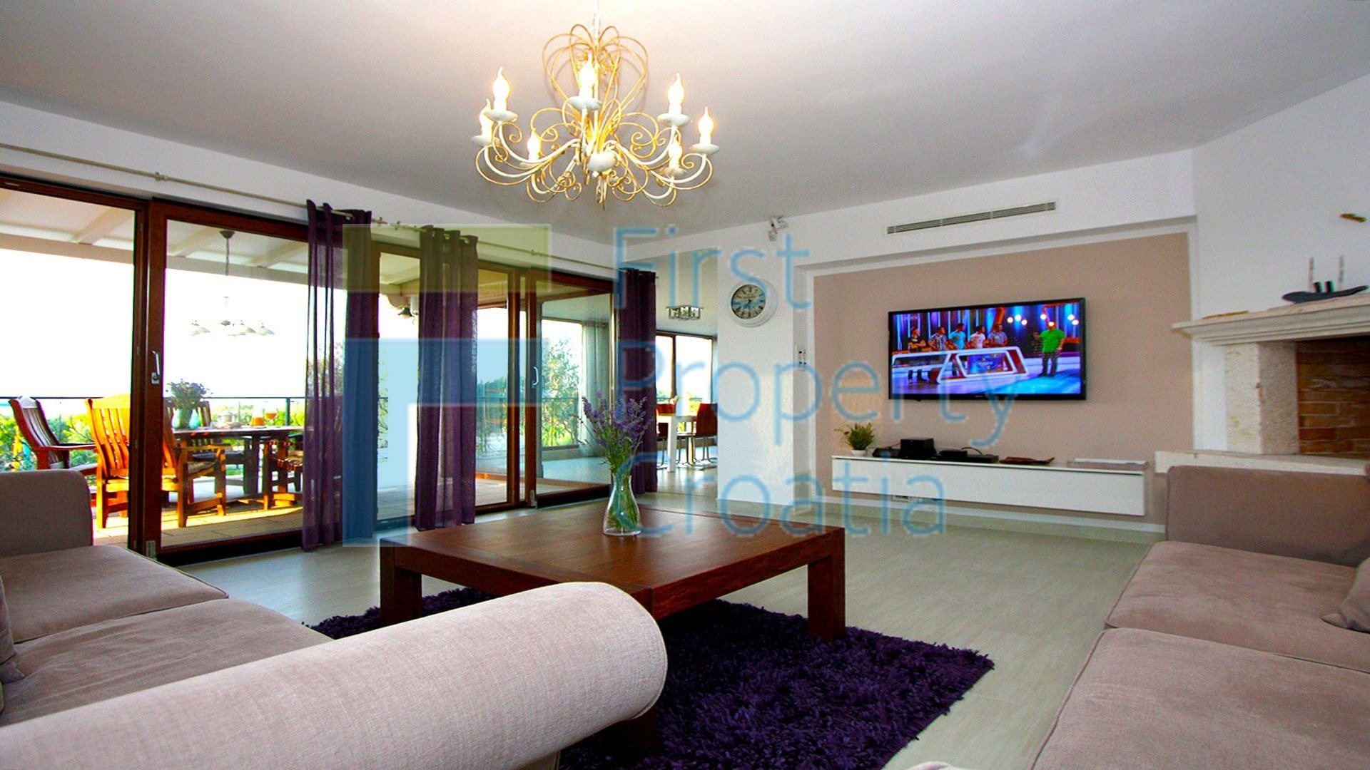 Ovo je dvoetažna kuća ukupne površine 239m2, uključujući terasu od 26m2 u prizemlju i prekrasnu terasu od 80m2 na prvom katu s koje se pruža prekrasan pogled na more i okolicu. Prizemlje površine 126m2 sastoji se od hodnika, dnevnog boravka, blagovaonice i kuhinje, kupaonice i dvije spavaće sobe. Vani je uistinu prostran bazen s mlaznom kadom, igralištem i lijepom terasom s roštiljem i blagovaonicom. Prvi kat površine 113m2 sastoji se od wc-a, predsoblja, dvije spavaće sobe i terase s pogledom na more površine 80m2 s hidromasažnom kadom. Moderan namještaj i kućanski aparati, solarna energija i umirujuće mediteransko raslinje koje okružuje vilu neke su od dodatnih prednosti ove nekretnine.