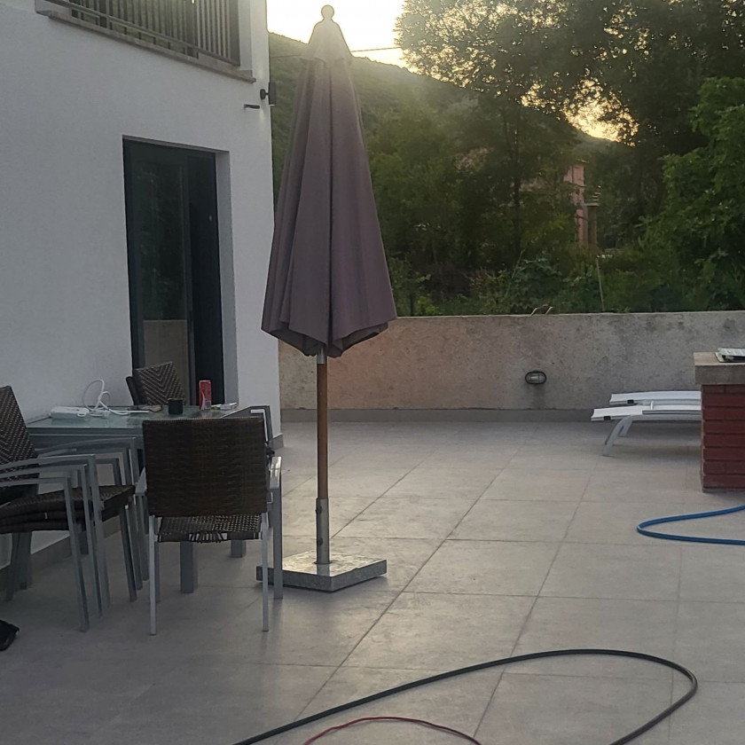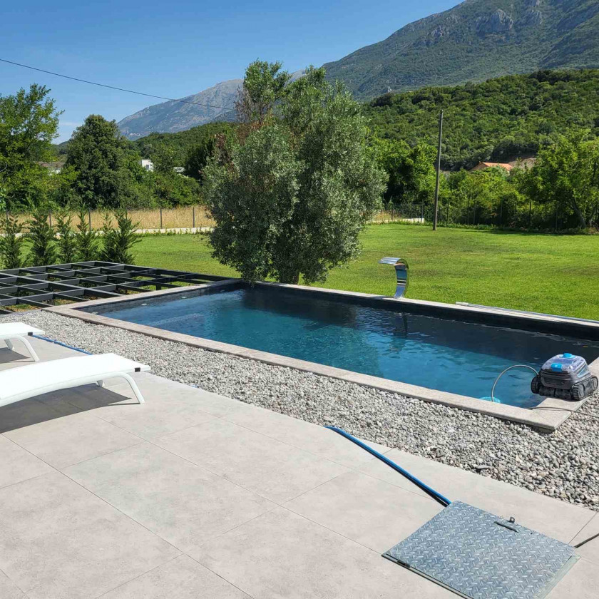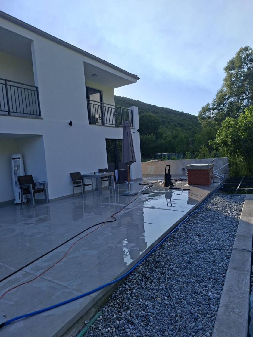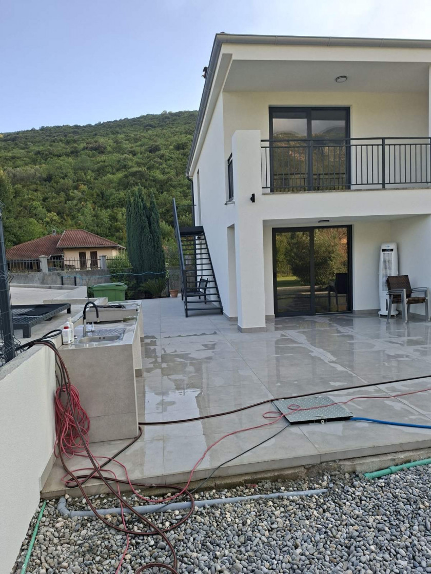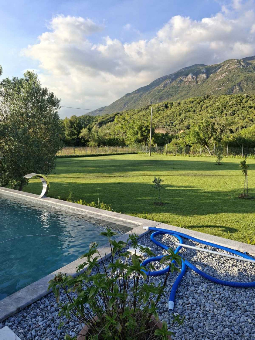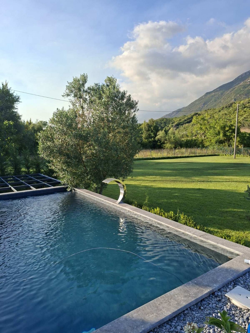 Opis: Na prodaju kuća sa bazenom u mirnom okruženju prepunom zelenila, u naselju Kovačko polje, Kotor. Na placu se nalazi i pomoćni objekat 26m2. Kuća je na dva sprata, prvi sprat je potpuno završen sa 2 sobe svaka sa svojim kupatilom, dnevni boravak i wc za goste, kuhinja i ostava. Drugi sprat koji nije završen (uvedeni voda i struja), podijeljen je na dva apartmana.