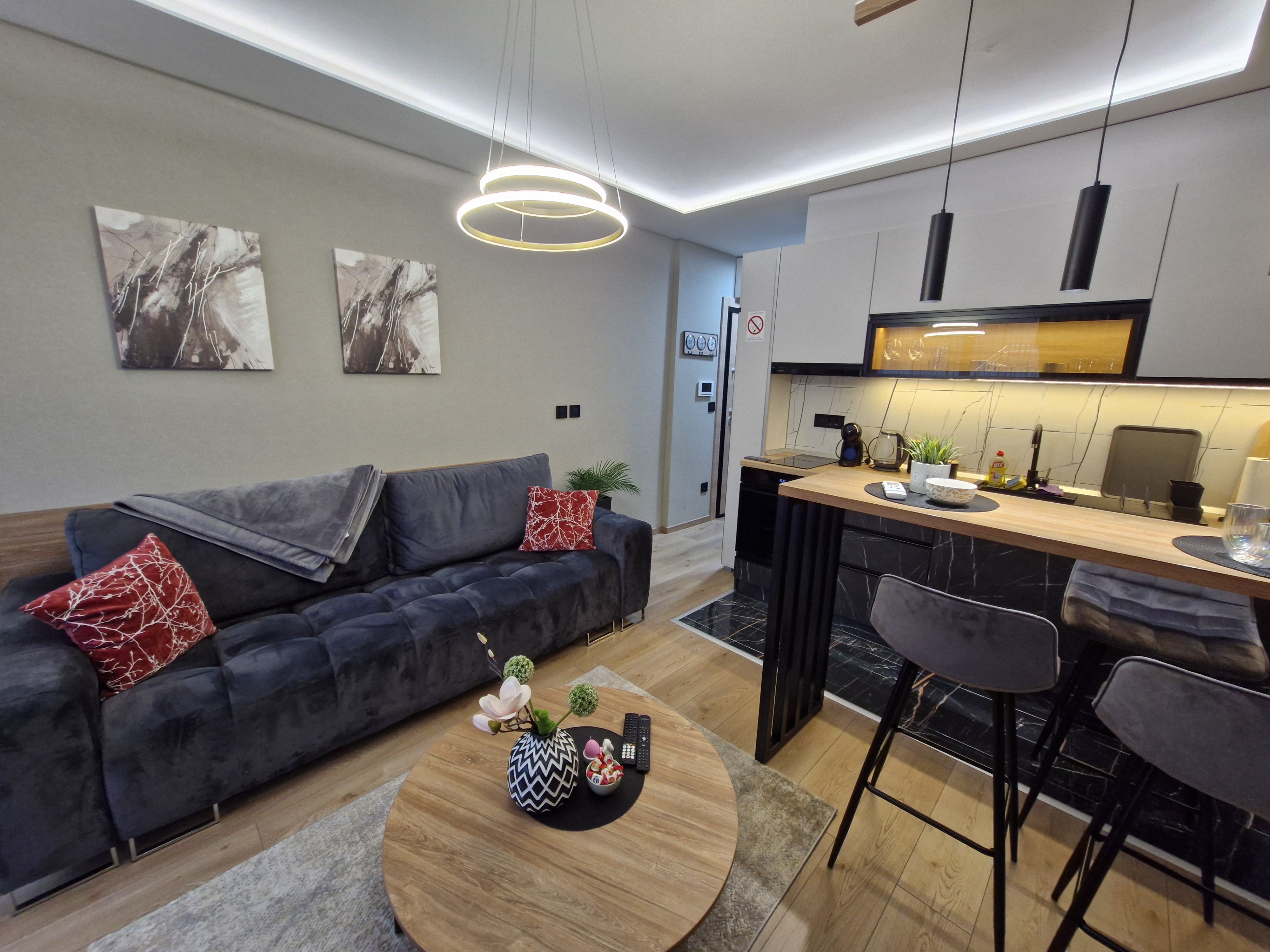 Opis: Apartman Virtus 1 nalazi se u samom centru Vrnjačke Banje, na adresi Cara Dušana 26, preko puta hotela i lečilišta Merkur. Ovaj luksuzno opremljeni apartman pruža savršenu kombinaciju komfora, elegancije i funkcionalnosti, čineći ga idealnim mestom za odmor i uživanje. Dnevni boravak uređen je modernim i udobnim nameštajem, stvarajući prijatan ambijent za relaksaciju i druženje. Spavaća soba poseduje udoban bračni krevet, dok je kuhinja u potpunosti opremljena svim neophodnim elementima. Sadrži indukcionu ploču, rernu, ketler, frižider, posuđe i escajg. Kupatilo je moderno uređeno, sa tuš kabinom, peškirima i svim neophodnim toaletnim potrepštinama. Apartman je opremljen brzim Wi-Fi internetom, EON box programima i klimatizacijom, kako bi boravak bio prijatan u svim vremenskim uslovima. Gostima je na raspolaganju i privatni parking, što dodatno doprinosi udobnosti i sigurnosti. Zahvaljujući svojoj izuzetnoj lokaciji, u blizini svih glavnih atrakcija, šetališta, restorana i kafića, Apartman Virtus 1 je savršen izbor za parove, porodice i sve koji žele da iskuse spoj luksuza, komfora i opuštanja tokom boravka u Vrnjačkoj Banji.