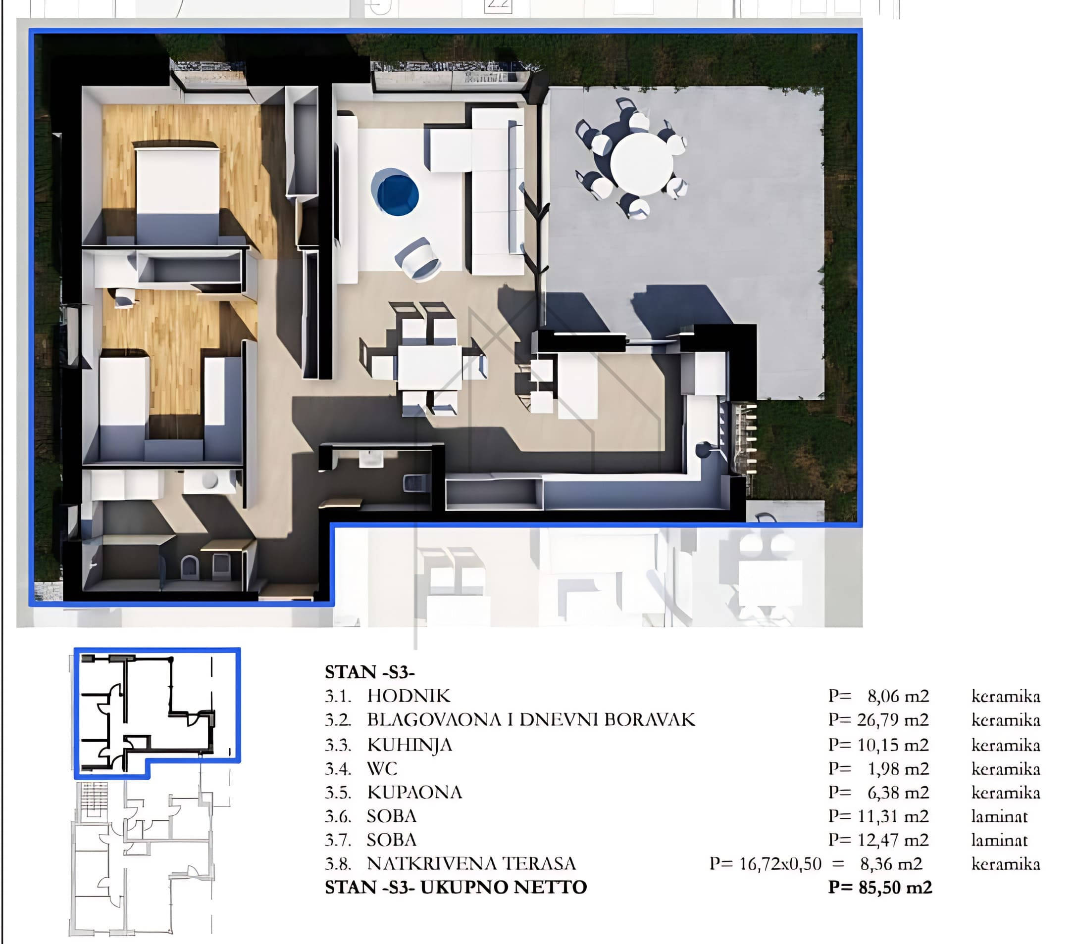 Opis: Labin, novi stan u urbanoj vili. U mirnoj i rezidencijalnoj zoni grada, nudimo na prodaju stan. Smješten na nekoliko minuta hoda od centra, svih urbanih sadržaja, na lokaciji okruženoj manjim zgradama i zelenim livadama. Očekivani rok dovršetka i preuzimanja stana je 2027. Stan se prodaje nenamješten, Parkirna mjesta kupuju se zasebno po cijeni od 5.000 EUR (PDV uključen). Grijanje je predviđeno klima uređajima s inverterom (grijanje/hlađenje). Stan prodaje pravna osoba, u cijenu je uključen PDV i ne plaća se porez na promet nekretnina. Prizemni stanovi raspolažu s vrtom koji s e zasebno plaća od 5.000 - 10.000 EUR (PDV uključen) a cijena ovisi o površini samog vrta Labin, stan u urbanoj vili, smješten je u zgradi s ukupno 8 stanova. Stan je smješten u objektu suvremenog, modernog izgleda, lijepo uklopljenog u neposredni okoliš. Mikrolokacija je dovoljno mirna, iako blizu svim gradskim sadržajima. Slikoviti Labin, šarmantno spaja bogatstvo arhitekture i kulturno-povijesnih spomenika s brojnim umjetničkim ateljeima, ugodan je grad po mjeri čovjeka. S obzirom na lokaciju, ovaj stan s blizinom vrtića, škole i ostalih urbanih sadržaja može biti idealna nekretnina za mladu obitelj....