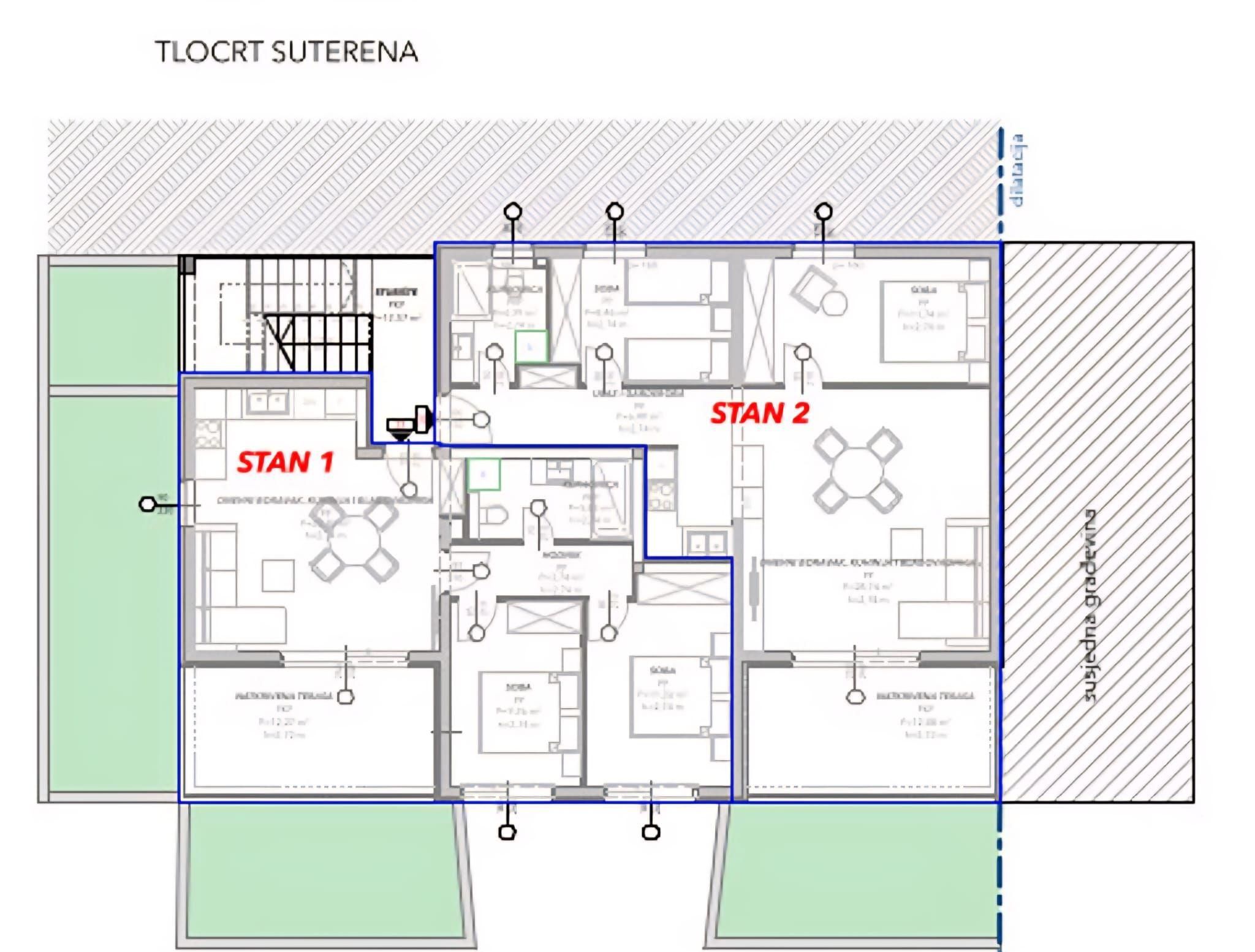 Zgrada je kvalitetno građena i prostire se na četiri etaže: suteren, prizemlje, prvi kat i podrum. Na svakoj etaži nalaze se po dva stana, što osigurava mir i privatnost.