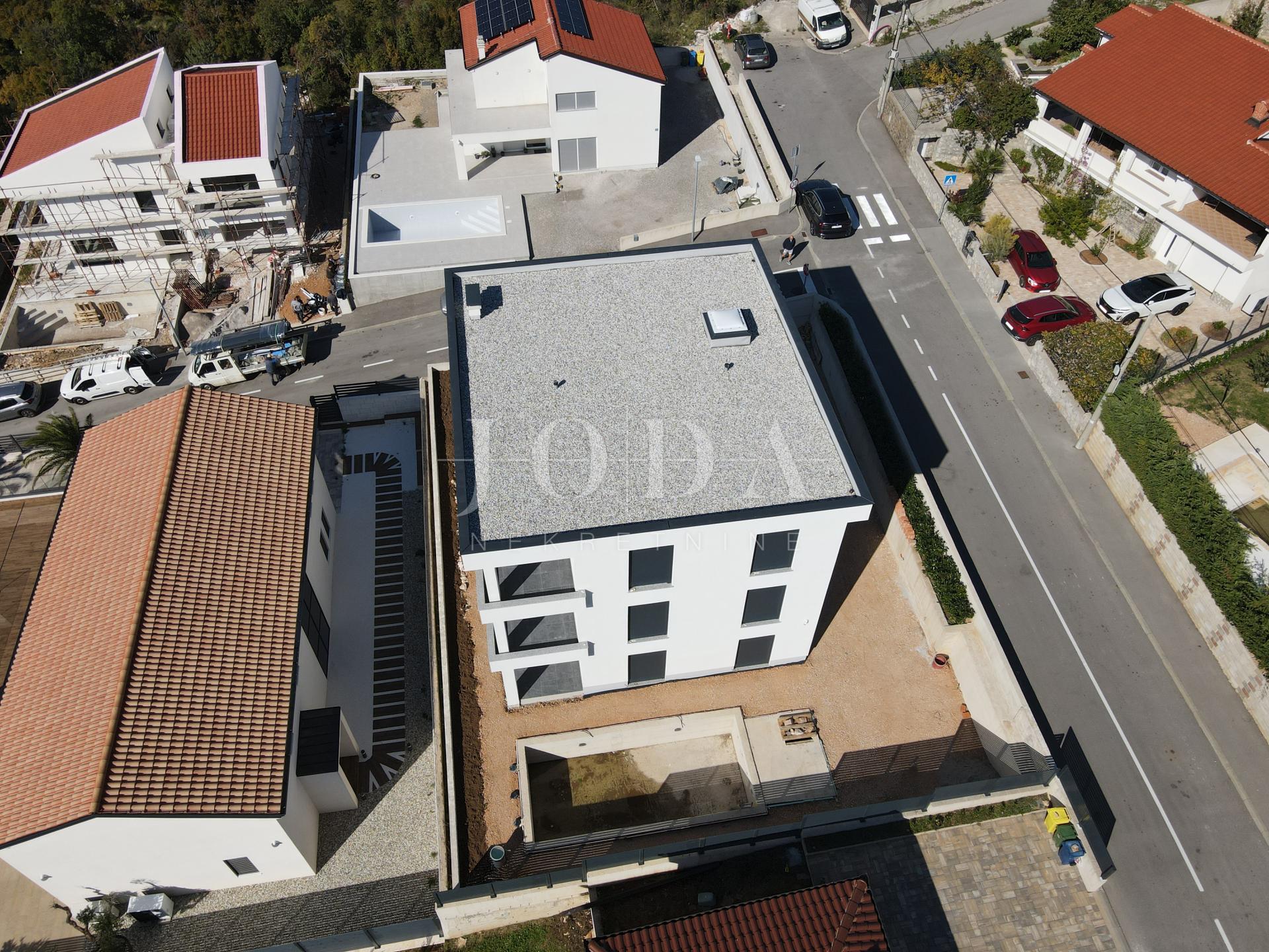 Stanovi na katu imaju i pogled na more,dok je u prizemlju bazen.Prodaje se u stanju visoki roh bau,što ostavlja mogućnost odabira podnih obloga po volji kupca.