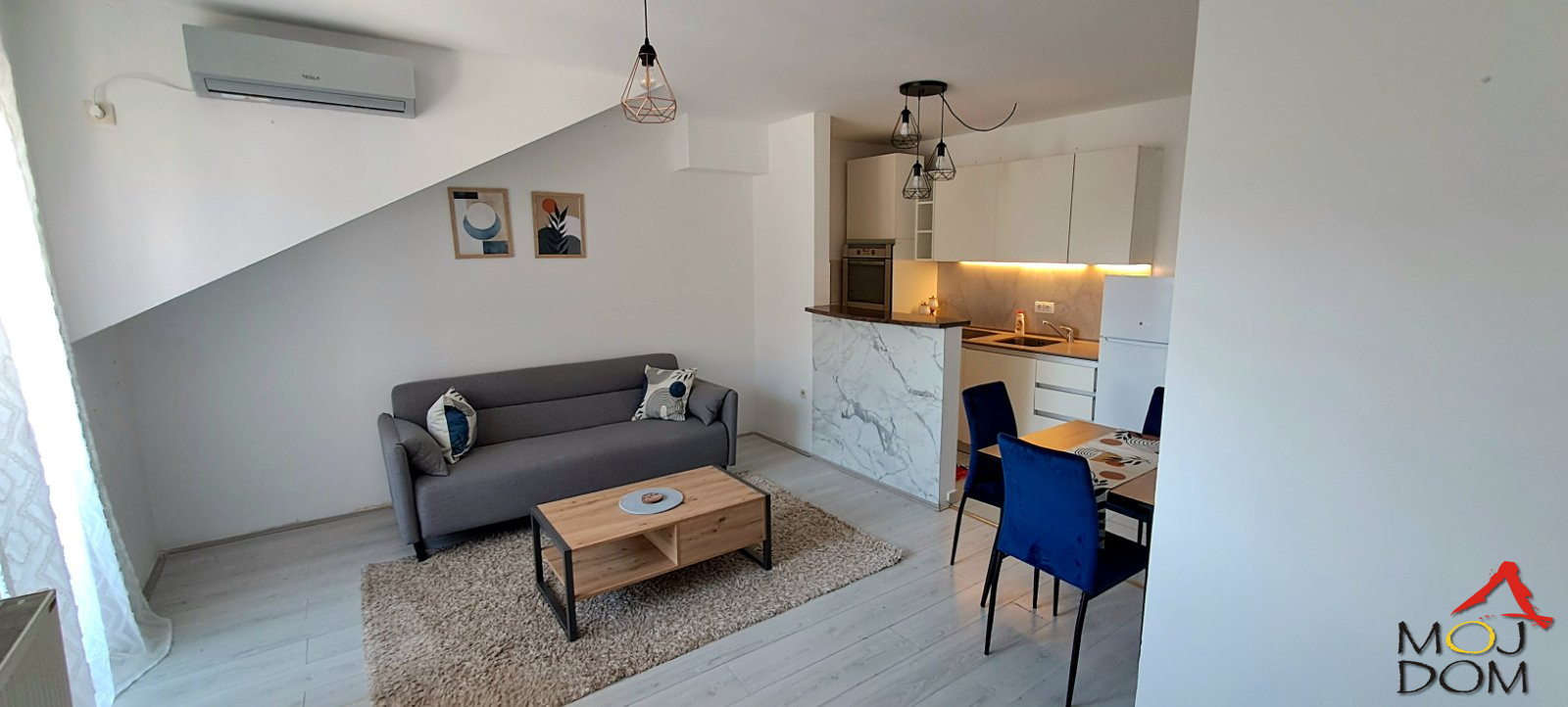 Stan se nalazi u kvalitetnoj zgradi i ima izuzetno funkcionalan raspored: sastoji se od prostrane spavaće sobe, manje sobe koja se po potrebi može koristiti kao radna ili dečija, ulaznog hodnika, kupatila i komforne dnevne sobe sa kuhinjom.