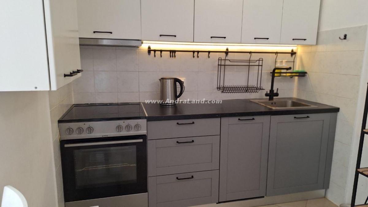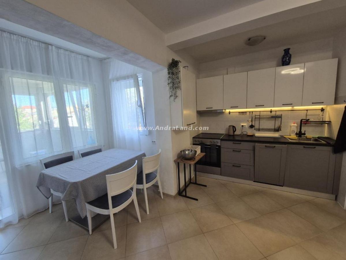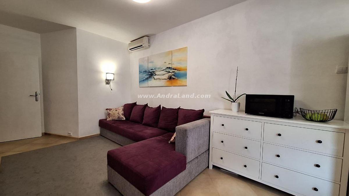 Opis: Ovaj udoban dvosoban stan nalazi se na 1. crnogorskom spratu (2. spratu) u četvorospratnoj zgradi. Sadrži udoban ulazni hol sa plakarom, dnevnu sobu sa velikom sofom na razvlačenje sa klima uređajem, novu kuhinju sa mašinom za pranje sudova, garderober ili radni kutak, jednu spavaću sobu sa bračnim krevetom i plakarom, i drugu spavaću sobu sa krevetom na sprat, radnim stolom i plakarom. Ima pogled na mirno zeleno dvorište i mali pogled na more. Ukupna površina je 60 m2 (37 m2 + zatvorena terasa pretvorena u zasebnu spavaću sobu). Udaljenost do mora sa peščanom plažom je 650 metara. Autobuska stanica je udaljena 2 minuta hoda. Prodavnice, restorani, kafići i pekare su udaljeni 5-7 minuta hoda. Zatvoreno zeleno dvorište sa rekreativnim prostorom. Javni parking je dostupan u blizini zgrade (uvek ima mesta). Dobar potencijal za izdavanje.