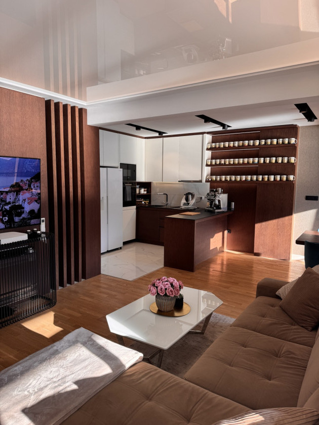 Sve sobe u stanu gledaju na zaljev, pružajući mirnu i ugodnu primorsku atmosferu. Apartman je namješten po najvišim standardima, a luksuzni interijer, dizajniran od strane arhitekta, kombinira eleganciju i funkcionalnost.