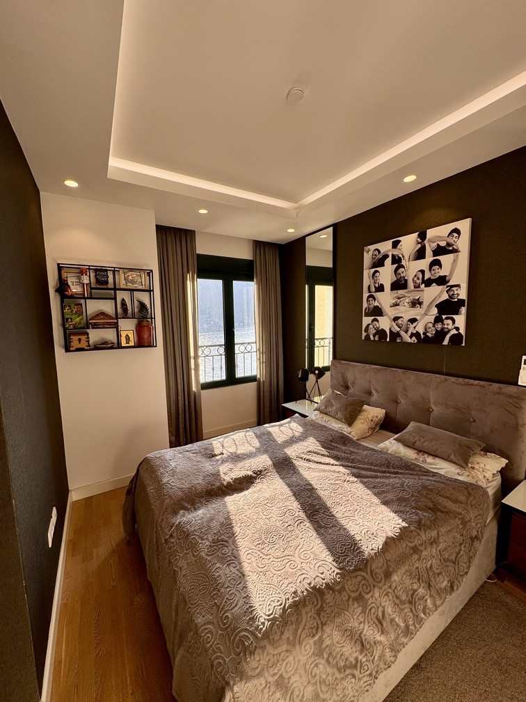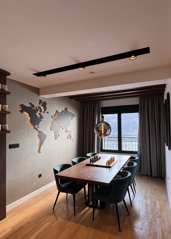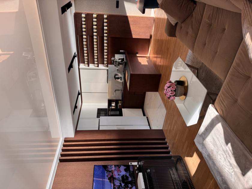 Sve sobe u stanu gledaju na zaljev, pružajući mirnu i ugodnu primorsku atmosferu. Apartman je namješten po najvišim standardima, a luksuzni interijer, dizajniran od strane arhitekta, kombinira eleganciju i funkcionalnost.