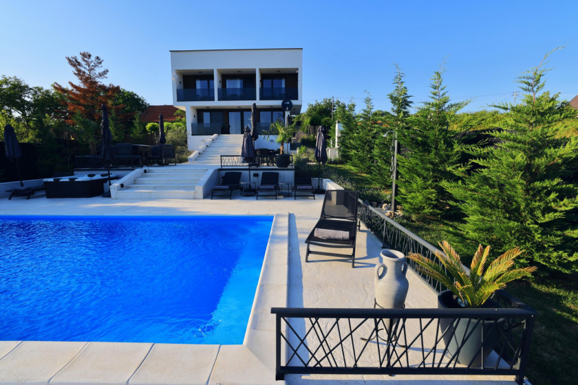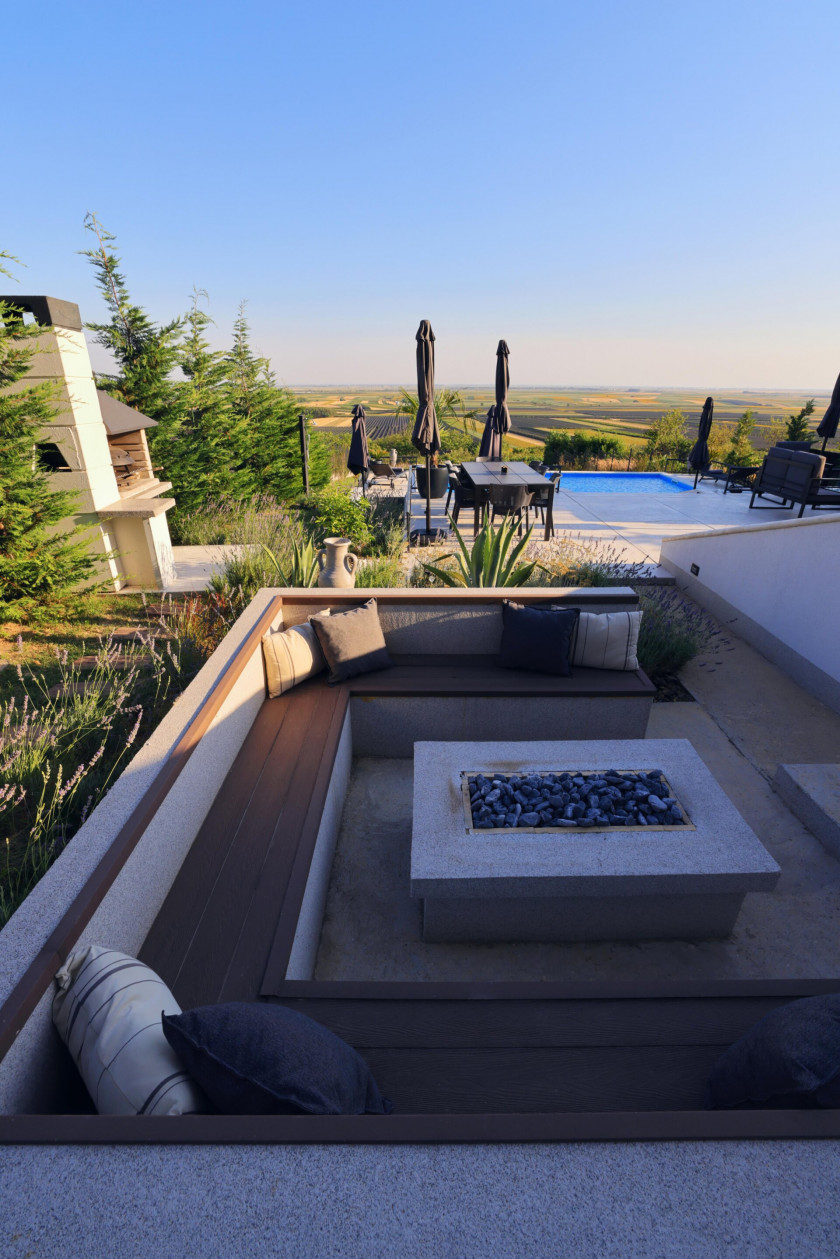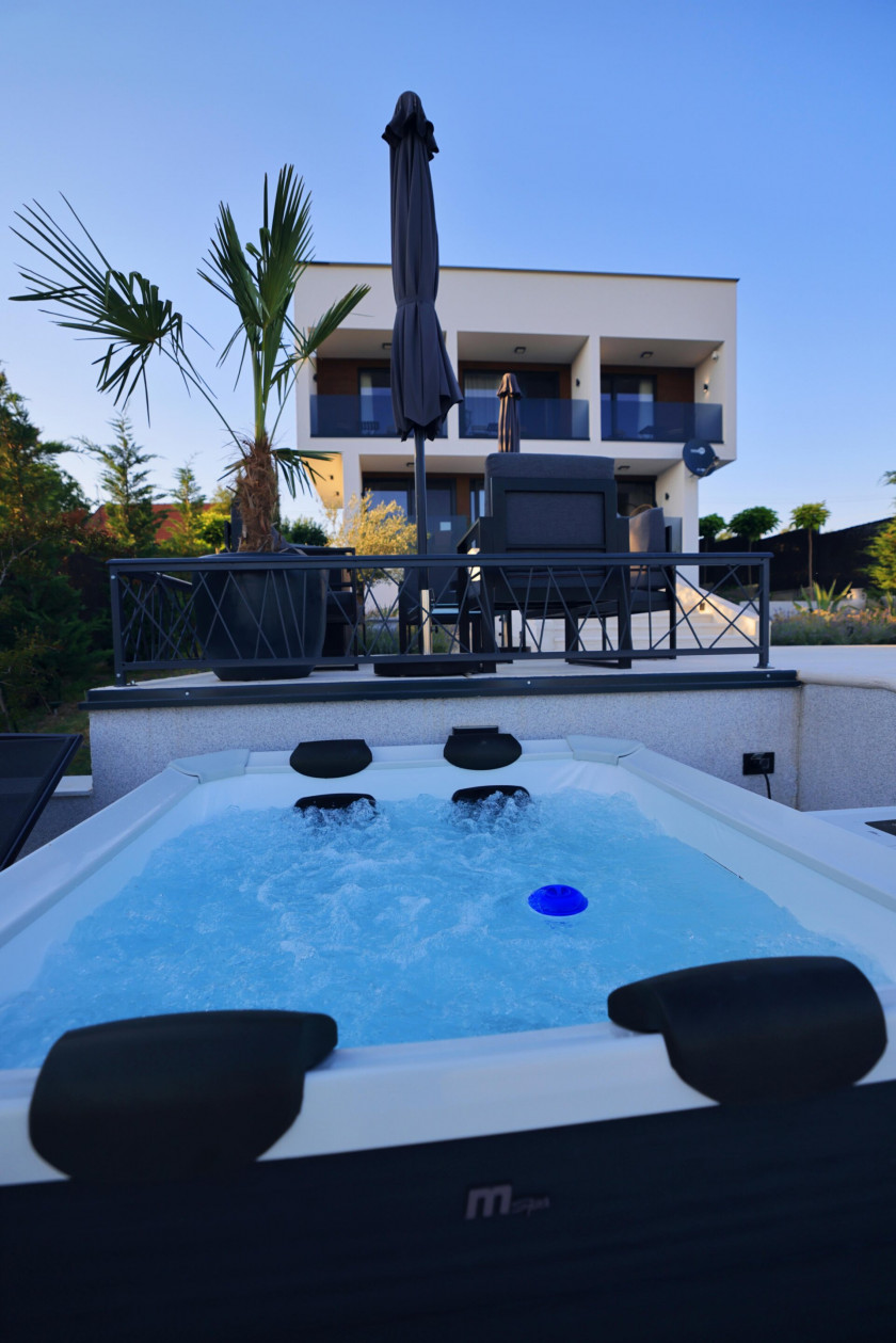 U centralnom delu dvorišta nalazi se veliki privatni bazen sa otvorenim pogledom na pejzaže Srema, dok jacuzzi pod vedrim nebom i zatvorena sauna upotpunjuju ponudu za potpuno opuštanje i regeneraciju. Prostrano dvorište sa lepo uređenim zelenilom pruža mnoštvo prostora za uživanje na otvorenom, a terasa i prostor za roštilj čine idealno mesto za okupljanja i obroke na svežem vazduhu.