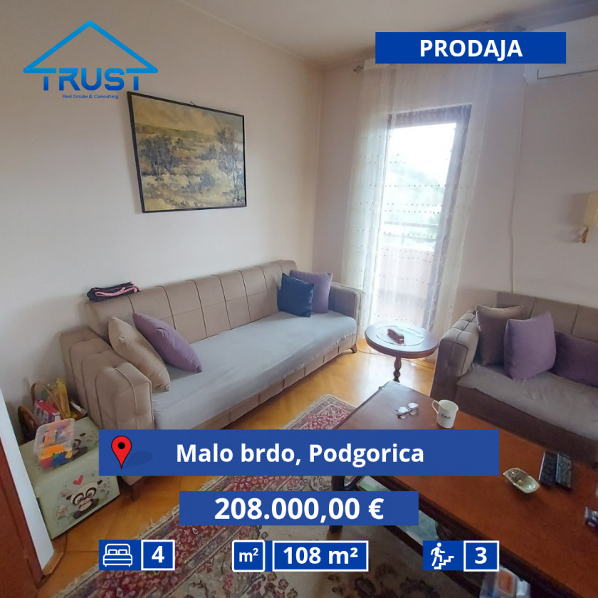 Vrsta: Prodajem Stan-Apartman Područje: Podgorica Lokacija: Malo Brdo Cijena: €208.000 Spavaćih Soba: 3 Kupatila: 2 Stambena Površina: 108 m2 Klima Uređaj Čuvajte se prevara: NE vršite IBAN uplate