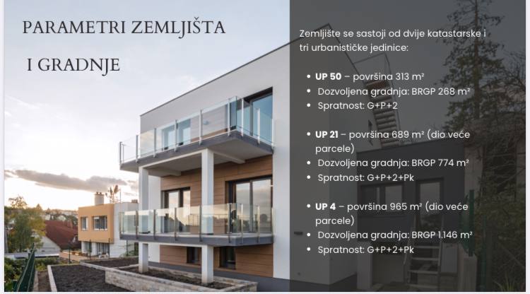 • UP 4 – površina 965 m² / gradnja 1.146 m² / spratnost G+P+2+Pk