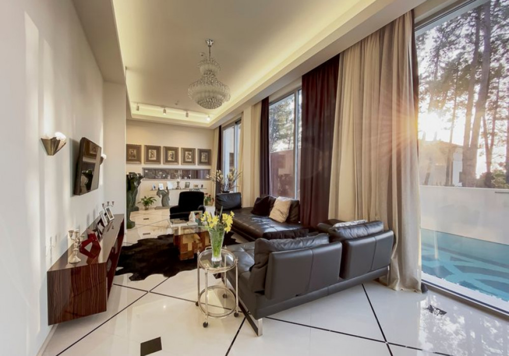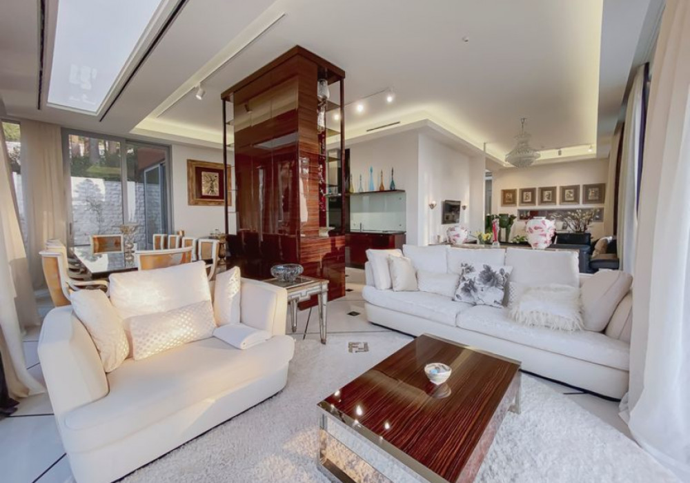 The villa has three floors. The total gross area of the house is 998 m2 (excluding the patio on the minus ground level). The net area of the house without a patio is 862 m2. The net living area (excluding the garage, swimming pool and its recreation area, technical rooms, solarium) is 559 m2. The house is located on a slope so that it has two floors facing south and three floors facing north - to the cliff in the direction of St. Stephen, as well as a flat operable roof.