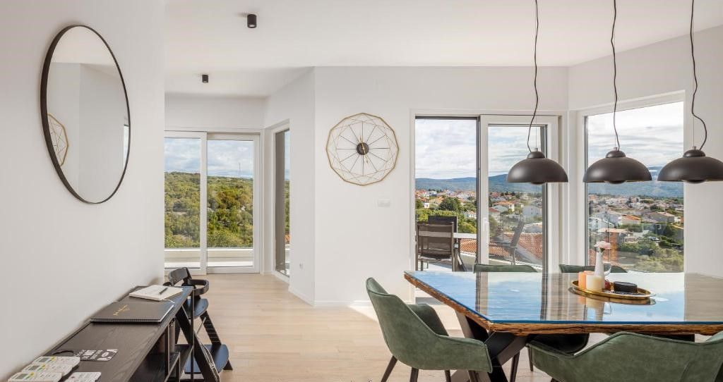 Opis (Engleski): Magnificent design penthouse in the town of Krk with sea views, just 500 meters from the sea!Ready to move-in!On the island of Krk, in the city of Krk, we offer this furnished three-bedroom stylish apartment with a large balcony and a beautiful view of the city of Krk and the sea. It is located on the second floor of a residential building. The apartment has a living area of 84 m2, while the astonishing terrace with fantastic sea views is 30 m2. The apartment consists of three bedrooms, two bathrooms, a kitchen and a large living room that has been converted into a spacious dining room and a balcony. The apartment has two parking spaces. Highly desired destination in the town of Krk on krk island.Less than 500 meters from the city center and the first beaches, and all other facilities (school, kindergarten, shopping centers, restaurants) nearby. This apartment stands out with its spacious terrace and a beautiful view of the sea and the city itself. Only one bedroom does not have a sea view. The apartment is used as a tourist rental and has above average occupancy. The apartment is competently furnished and ready to move in immediately....