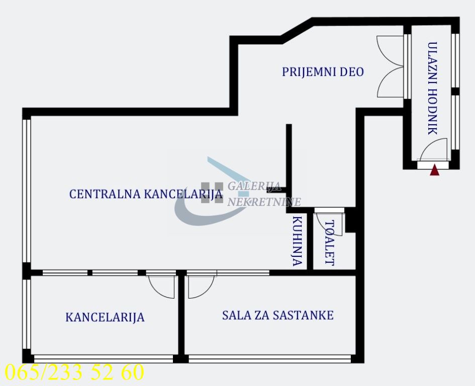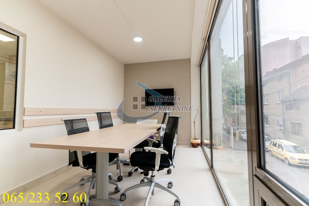 Od prostorija: ulazni hodnik, prijemni deo, toalet, open space sa kuhinjskim delom, kancelarija i soba za sastanke.