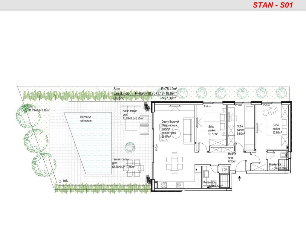 Tip: Trosoban stan s terasom, vrtom i bazenom