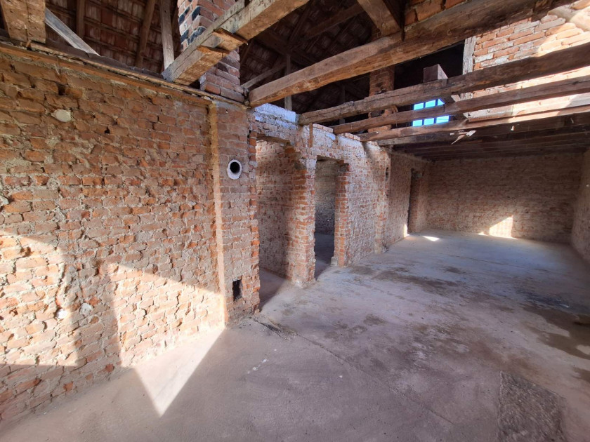 Glavni objekat je porodična kuća horizontalnih gabarita 11 x 8 metara, površine 88 m², izgrađena osamdesetih godina od sitne cigle, poznate po svojoj trajnosti i toplotnoj stabilnosti. Kuća je visoka prizemnica, trenutno u fazi renoviranja – zidovi su ogoljeni i spremni za završne radove po želji budućeg vlasnika.