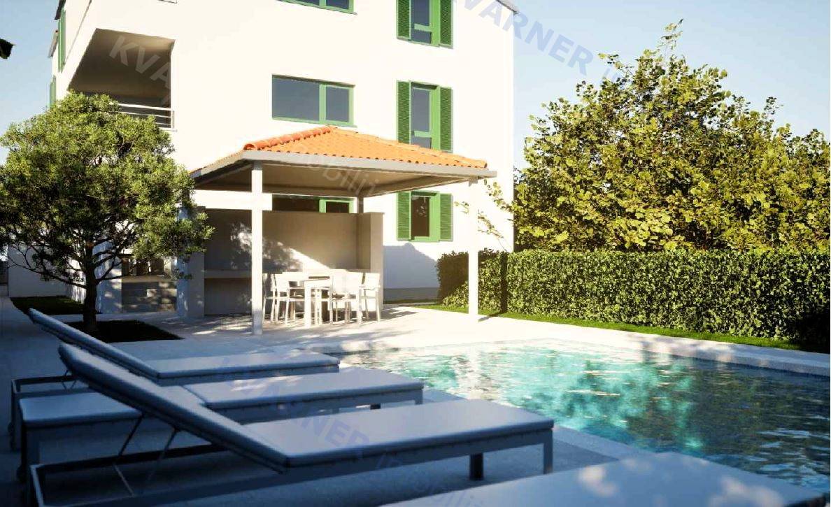 Stan se sastoji od kuhinje, blagovaonice i dnevnog boravka otvorenog koncepta, tri spavaće sobe te dvije moderno uređene kupaonice. Iz dnevnog boravka izlazi se na prostranu terasu od 17 m², a stanu pripada i vlastita okućnica s bazenom, idealna za opuštanje i uživanje u privatnosti. Uz stan dolaze dva parkirna mjesta.