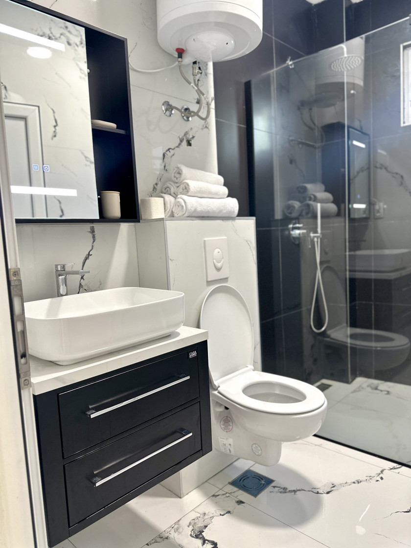 Izdaje se moderno i luksuzno opremljen stan površine 63 m², sa velikom privatnom terasom od 33 m² koja pruža spektakularan panoramski pogled na more.