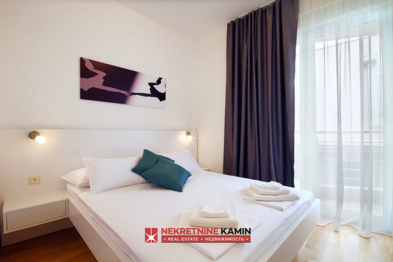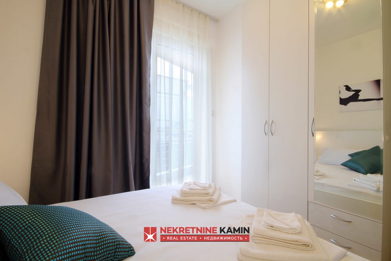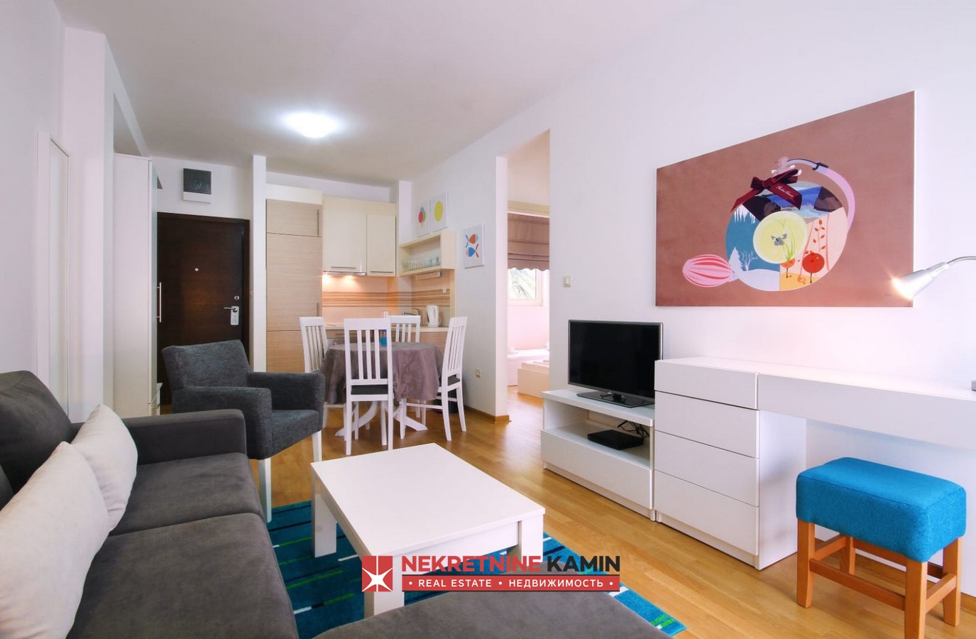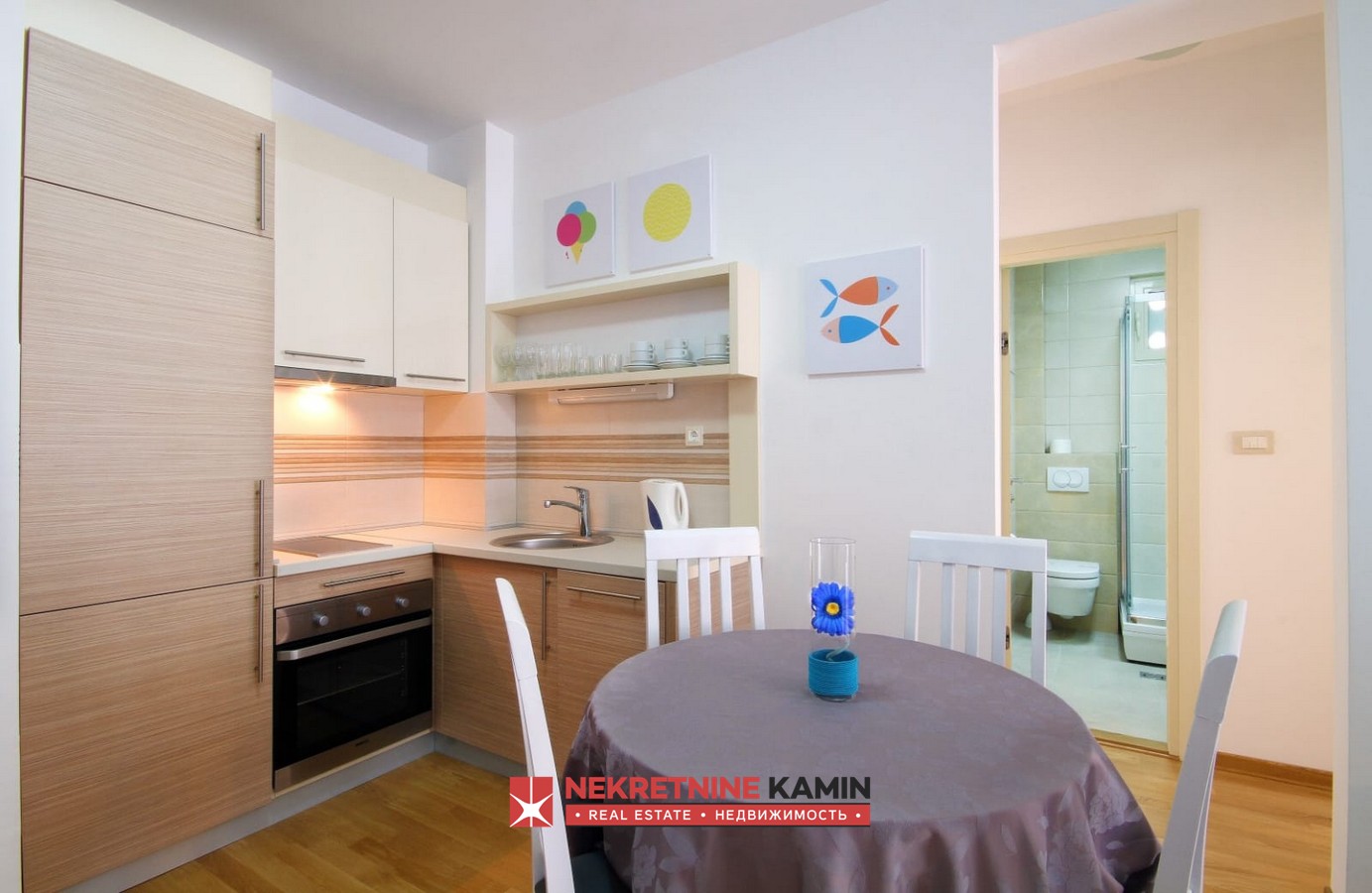 Stan se sastoji od dnevnog boravka sa kuhinjom i trpezarijom, spavaće sobe, kupatila i terase. U potpunosti je opremljen modernim namještajem i svim potrebnim uređajima za udoban boravak.