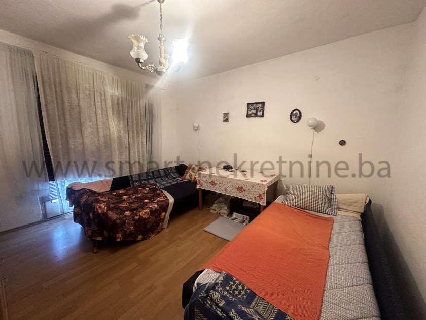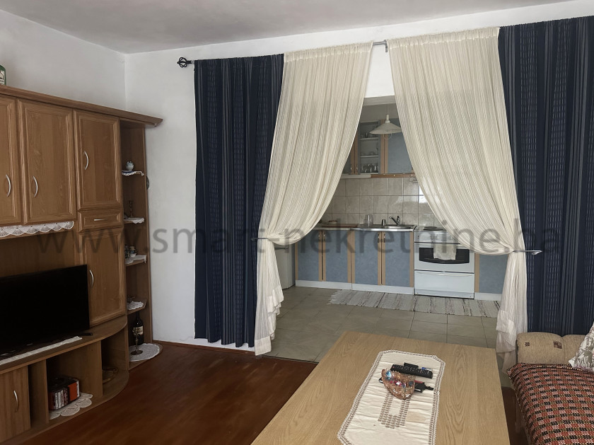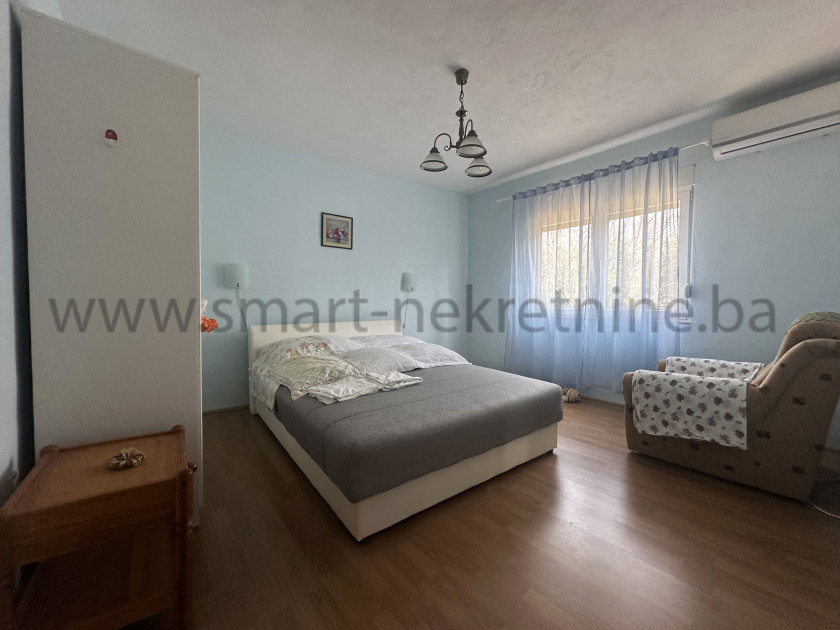 U prizemlju je smješten stan površine cca 120m2 koji se sastoji od dnevnog boravka sa kuhinjom, dvije spavaće sobe, kupatila, hodnika i ulazne terase. Vanjski i unutarnji otvori su drveni. Podovi su obloženi keramikom i laminatom.