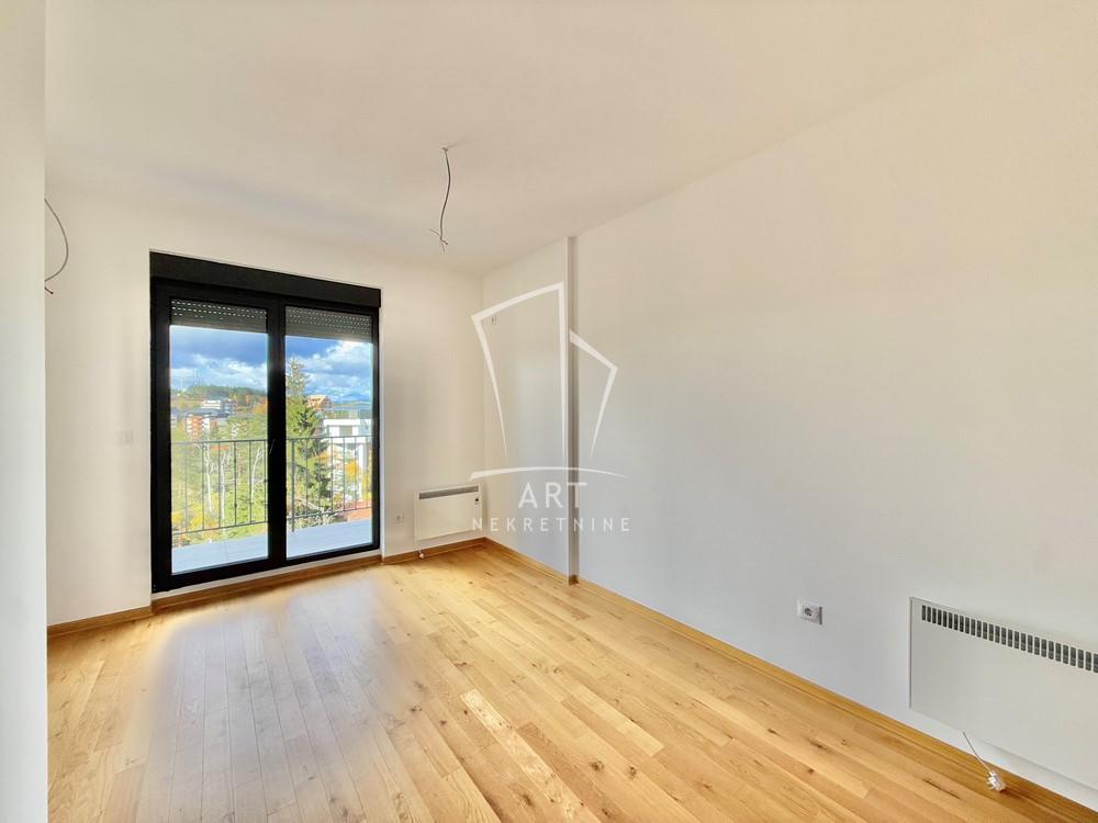 Nalazi se na petom spratu, od ukupno sedam. Sastoji se od predsoblja, dnevnog boravka sa trpezarijom i kuhinjom, spavaće sobe, kupatila i terase sa koje se pruža fenomenalan pogled.