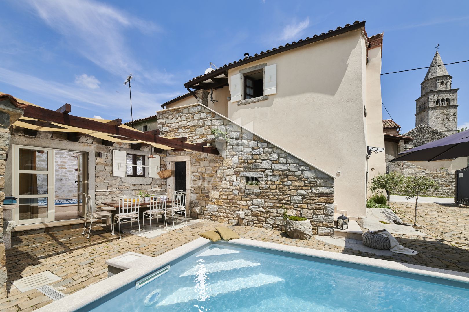 Ova predivna kuća u potpunosti je renovirana s iznimnim osjećajem za detalj i sklad između tradicionalne arhitekture i modernih potreba. U prizemlju se nalazi dnevni boravak s autentičnim ognjištem koji odiše toplinom i karakterom, kuhinja s blagovaonicom, gostinjski toalet te unutarnji bazen sa SPA zonom – pravi kutak za opuštanje tijekom cijele godine. Na katu su tri spavaće sobe, uključujući prostranu „family“ sobu s dodatnim ležajem, te tri elegantne kupaonice.