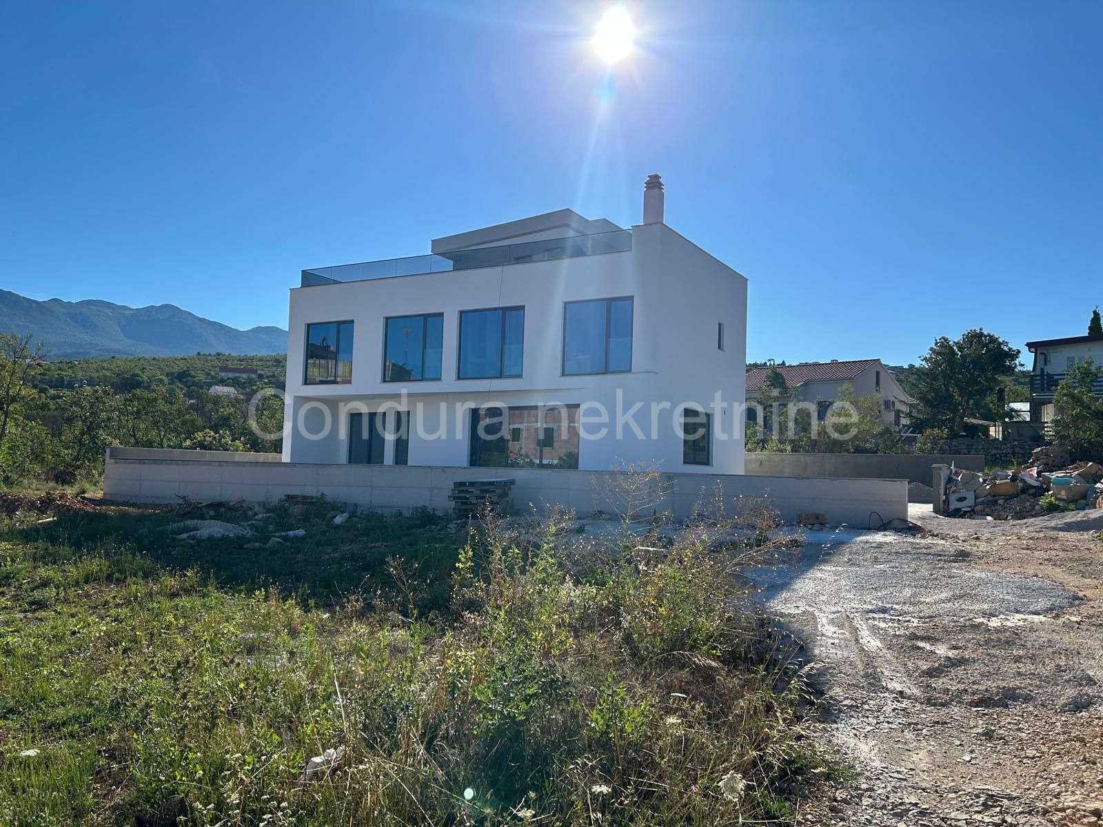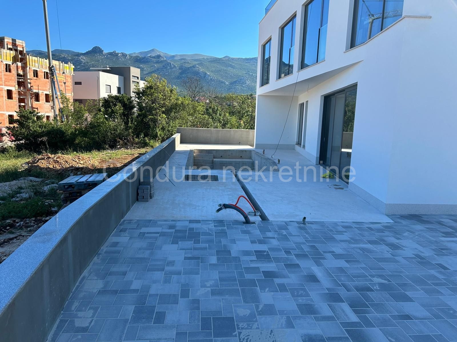 U dvorištu se nalazi vanjska kuhinja, terasa zamišljena kao prostor za druženje na koju se iz kuće izlazi kroz velike staklene stijene te grijani bazen (cca 30 m2) odmah uz terasu. Također, u dvorištu se nalaze 2 parkirna mjesta.