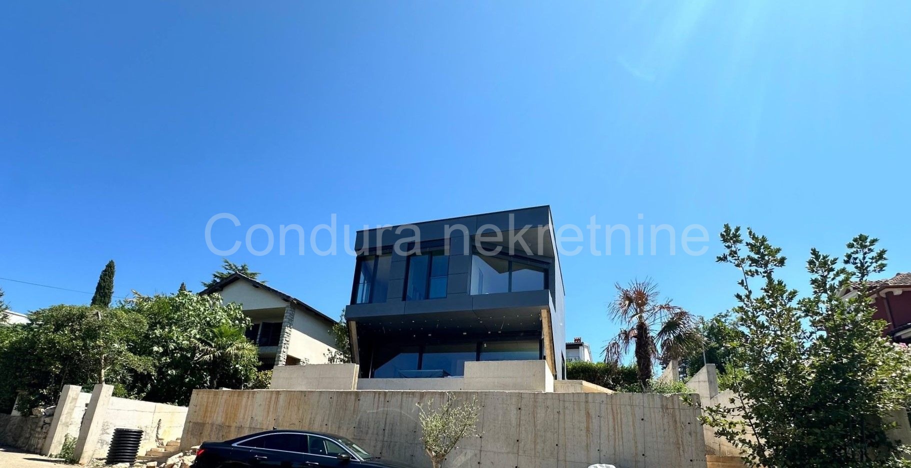 Iz blagovaonice i dnevnog boravka se kroz velike staklene stijene izlazi na natkrivenu terasu s pogledom na more, tik do koje se nalazi prelijevni bazen dimenzija 8 m x 3 m, dubine 120 cm.