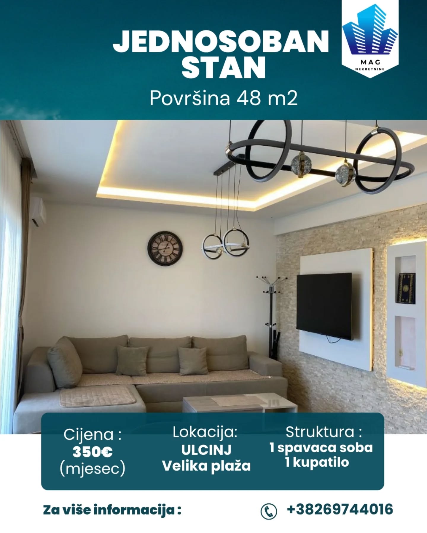 Opis: Izdaje se jednosoban namjesten stan u Ulcinju, Štoj u blizini Velike plaže