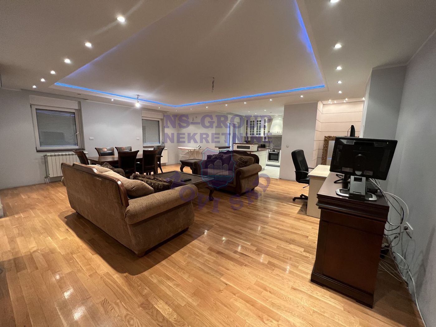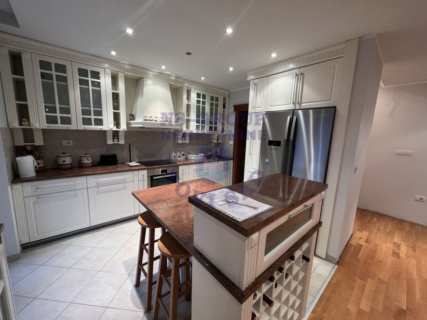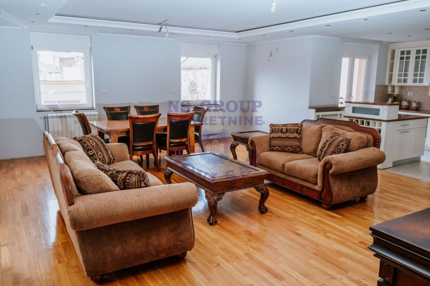Opis: Jedinstvena nekretnina kod Banovine. Zauzima celu treću etažu, prodaje se sa garažom u prizemlju objekta od 15m2. Projekat stana je odličan, veliki dn.boravak, izuzetno svetao sa kuhinjom i trpezarijom, 3 spavaće sobe, dva kupatila, garderoberi, ostave... Bez ikakvog ulaganja i prodaje se sa kompletnim nameštajem - sve na fotografijama! Odmah useljiv, u nekretnini se malo živelo ili skoro nikako.