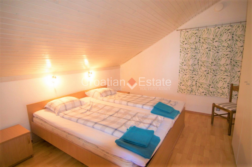 Nalazi se na pripadajućem zemljištu površine 411m2 i ima 270m2 stambenog prostora podijeljenog na tri etaže.