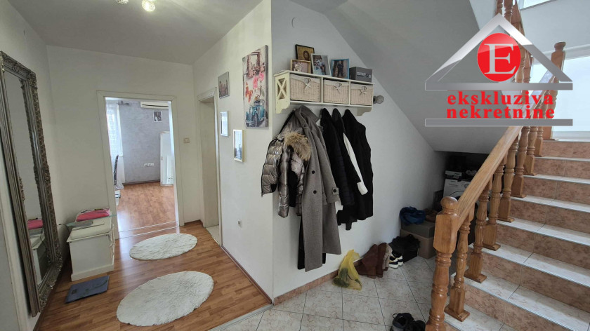 Unutrašnje stubište vodi na sprat koji se sastoji od 4 spavaće sobe od kojih dvije imaju izlaz na balkon, hodnika iz kojeg se takođe izlazi na veliku natkrivenu terasu i kupatila.