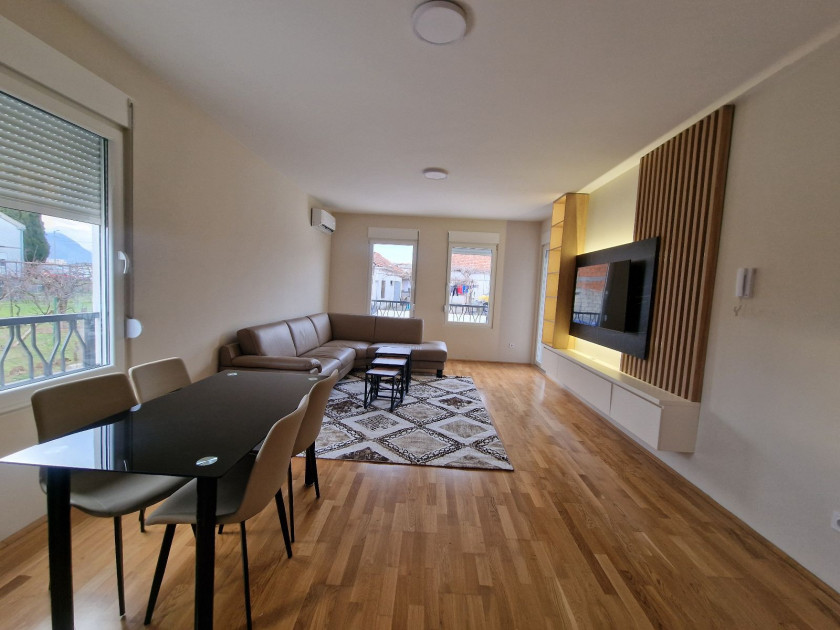 Opis: Na prodaju je potpuno nov, moderno namješten dvosoban stan,površine 70 m², smješten u visokom prizemlju nove stambene zgrade u blizini TC Big Fashion, Podgorica.