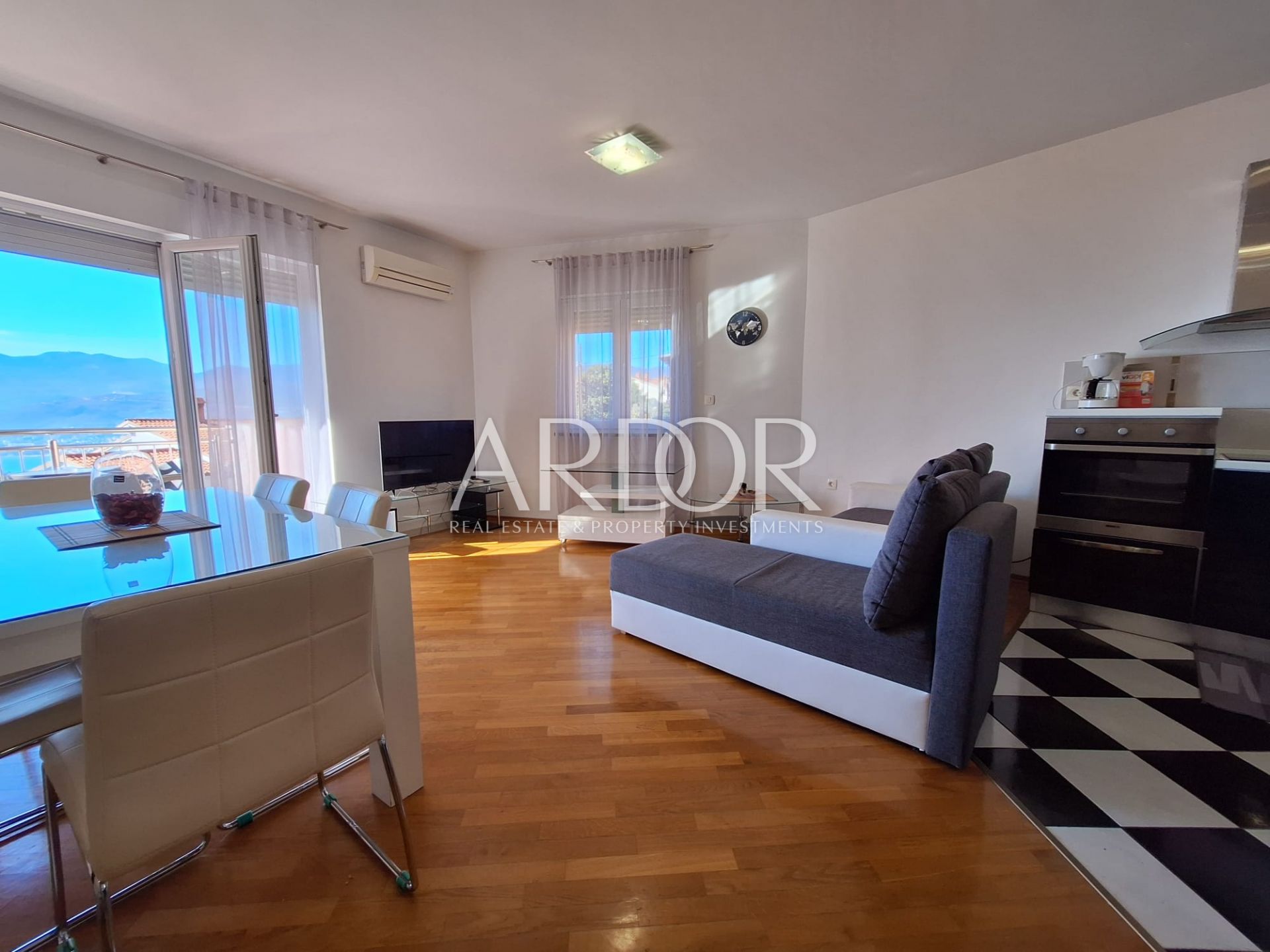 Dominantni dio stana čini veliki open-space dnevni boravak povezan s kuhinjom i blagovaonicom, iz kojeg se izlazi na prostrani balkon s prekrasnim pogledom na more i okolinu. Prostor je izuzetno svijetao, prozračan i moderan, idealan za opuštanje ili druženje.