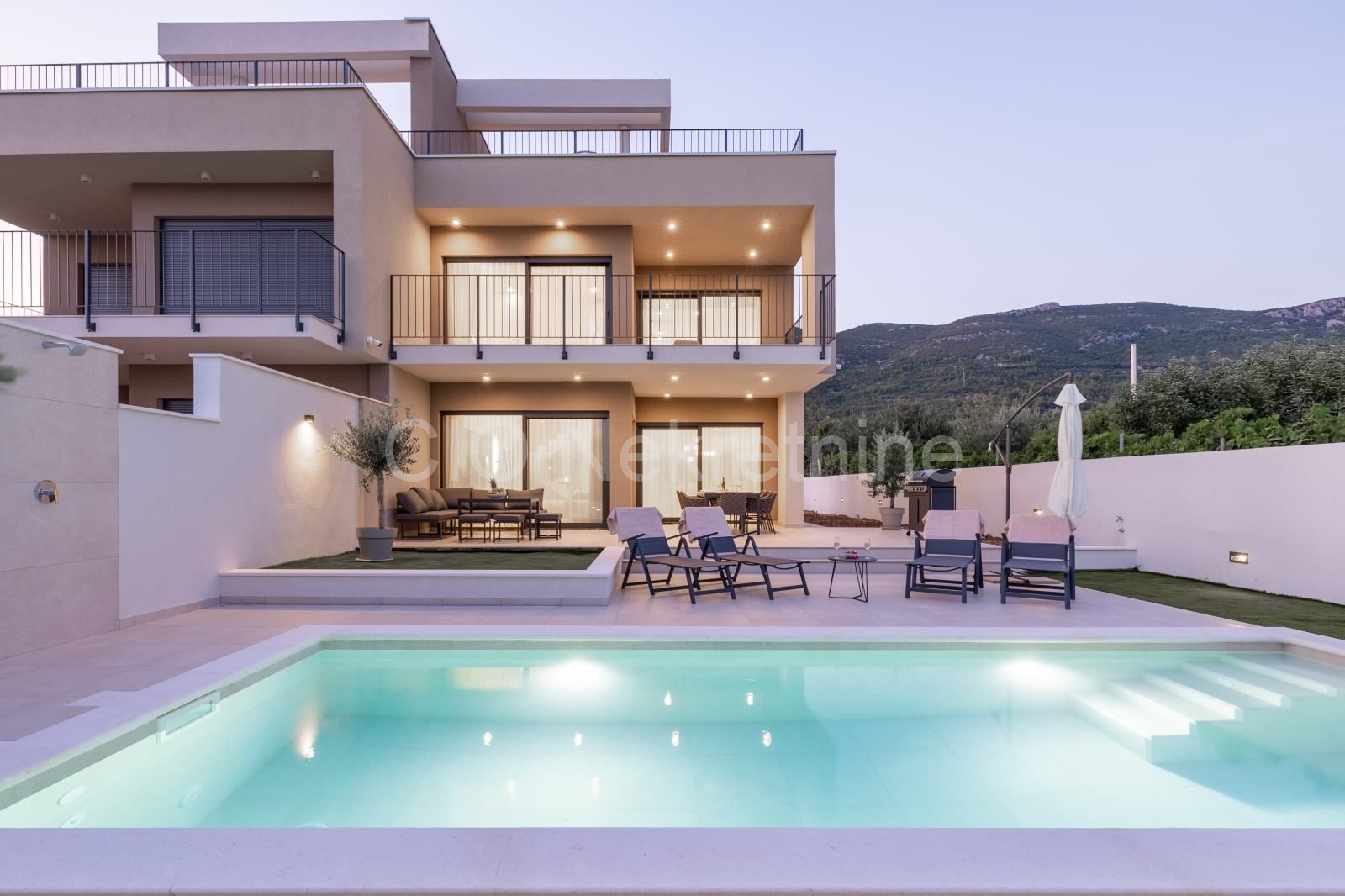 U prizemlju se nalazi prostrani dnevni boravak s izlazom na terasu i uređeni vrt u kojem se nalaze grijani bazen i solarij. Na katu su tri spavaće sobe, četiri kupaonice te terasa s panoramskim pogledom na more i okolne planine.