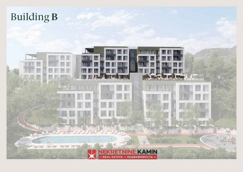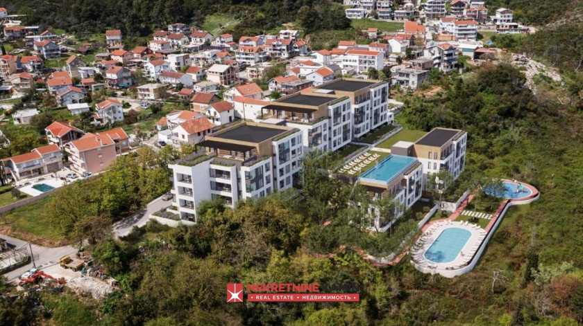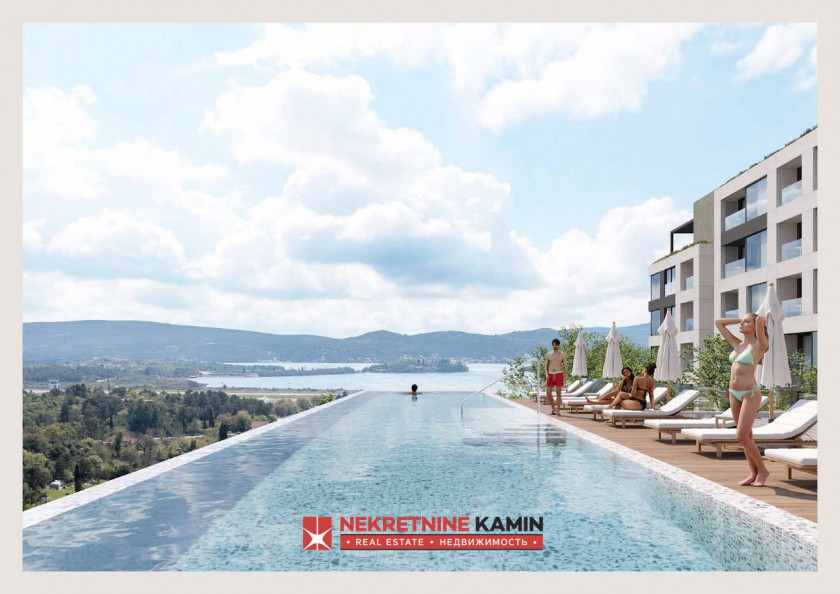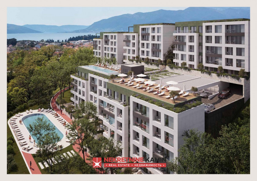 Opis: Na uzvišenju okruženom mediteranskim zelenilom, svega 2,5 km od centra Tivta i Porto Montenegra, razvija se moderan stambeni kompleks koji spaja savremeni luksuz, udobnost i spokoj prirode.