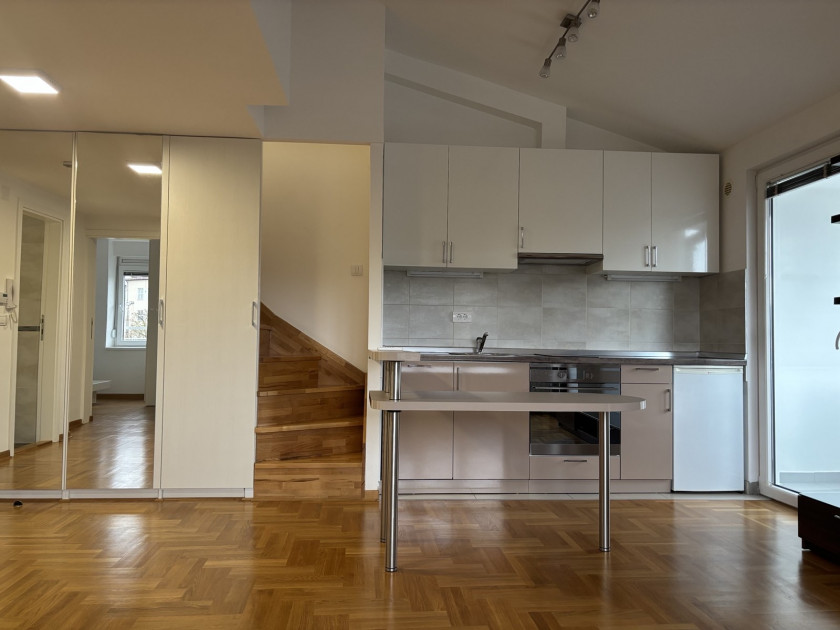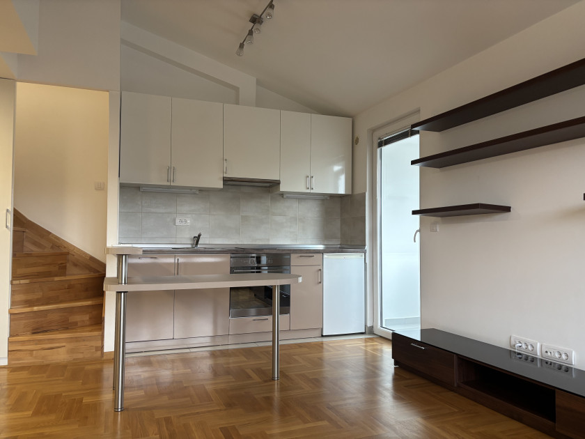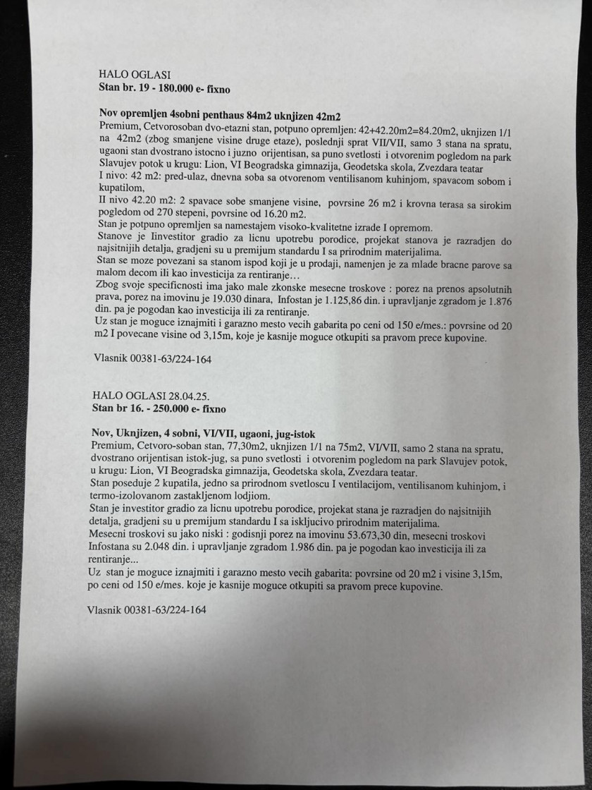Opis: Nov, 84 m2, uknjizen na 42m2, dvo-etazni, potpuno opremljen, nekoriscen stan, VII/VII ispod Liona kod Gradske bolnice. Zvezdare teatar, geodetske skole, gimnazije,parka Svavujev …