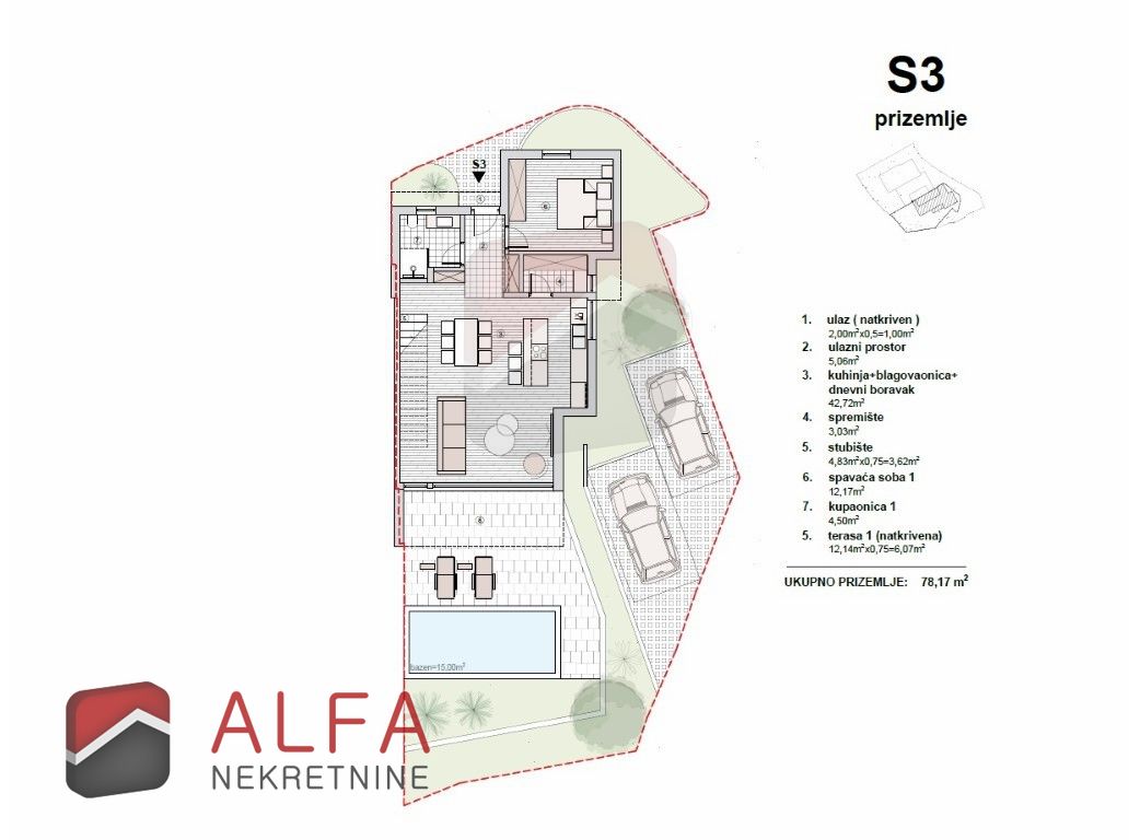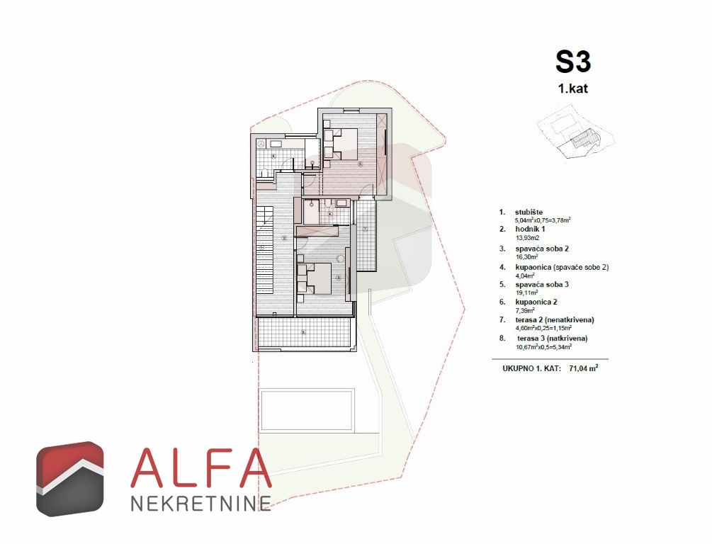 Stan S3 ima zaseban ulaz i sastoji se od tri etaže. Nalazi se u objektu (kuća u nizu) s tri povezane stambene jedinice.