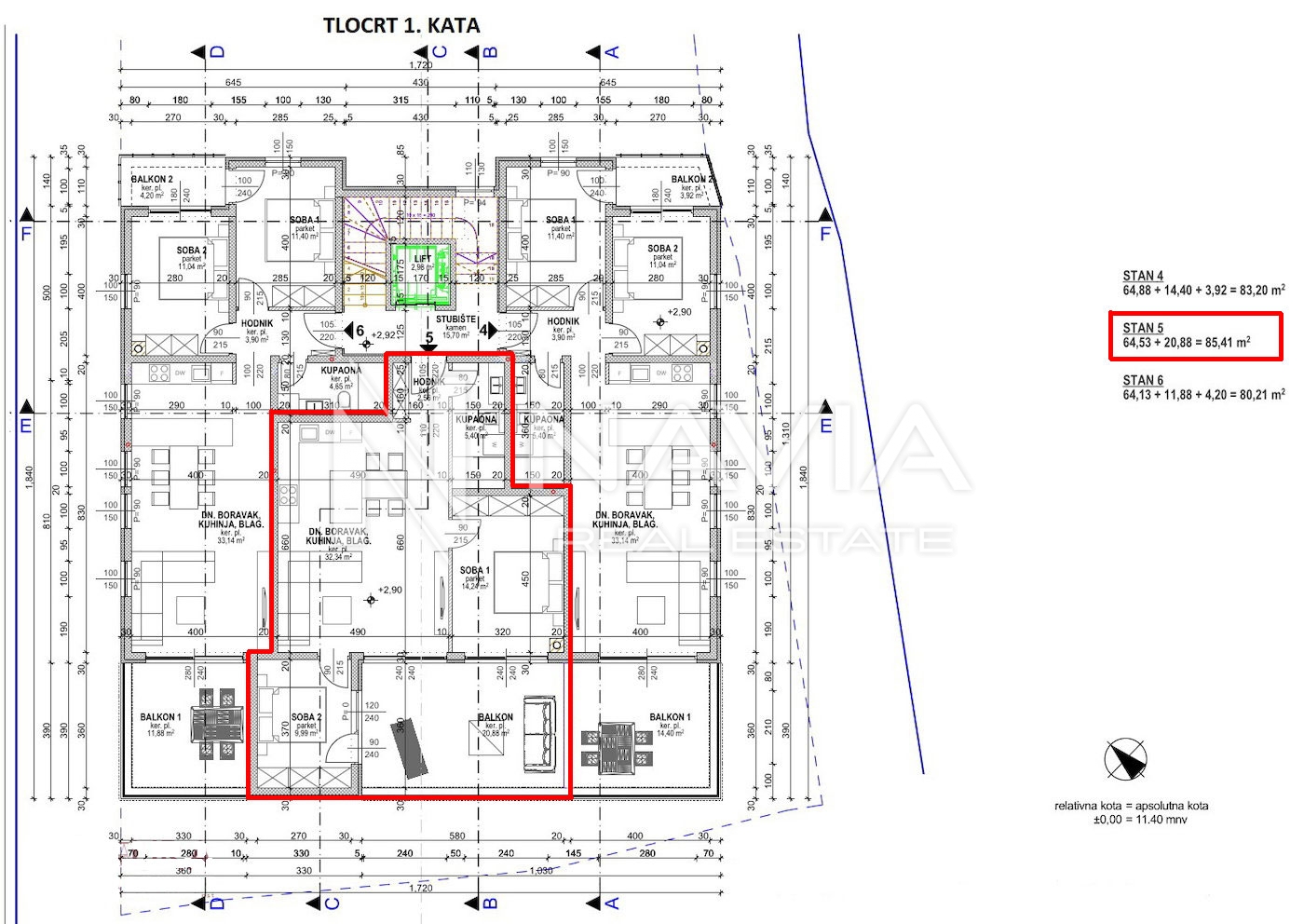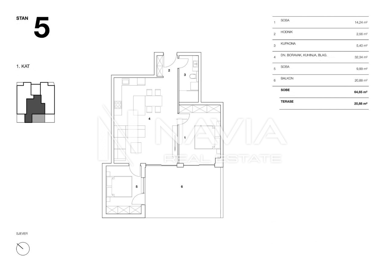 Opis: Prodaje se komforan stan na 1. katu novogradnje u Povljani, svega 250 metara od mora. Stan ukupne površine 85,41 m² sastoji se od: