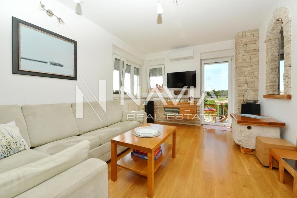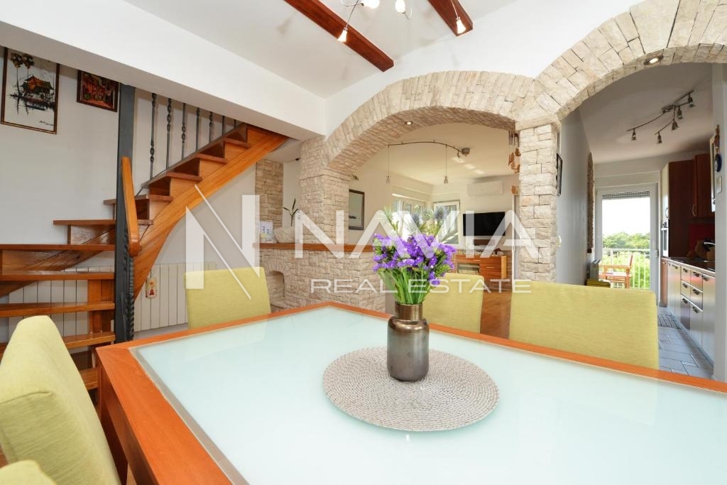 Opis: Na prodaju je trosoban stan na 4. katu stambene zgrade na Relji. Ukupne je površine 78m2 (u naravi 102m2). Stan je dvoetažni. Prva etaža sastoji se od ulaznog prostora, dnevnog boravka s blagovaonicom, kuhinje koja ima izlaz na balkon, kupaonice s WC-om, dvije spavaće sobe i balkona (zapadne orijentacije s pogledom na Poluotok). Na drugoj etaži nalaze se hodnik, spavaća soba i kupaonica s WC-om i prozorom (koja uz tuš kabinu ima i kutnu jacuzzi kadu). Iz određenih prostorija stana pruža se pogled na more. Zgrada ima vlastiti parking i opremljena je liftom. Grijanje je etažno centralno na struju, a stan ima dvije klime, po jednu na svakoj etaži. Podovi su obloženi hrastovim parketom od 20mm, dok su u kupaonama i kuhinji keramičke pločice. Na prozorima je PVC stolarija. Udaljenost od plaže Kolovare iznosi 300m. Stan se trenutno koristi za dnevni najam te ostvaruje izvrsne prihode. Prodaje se namješten.