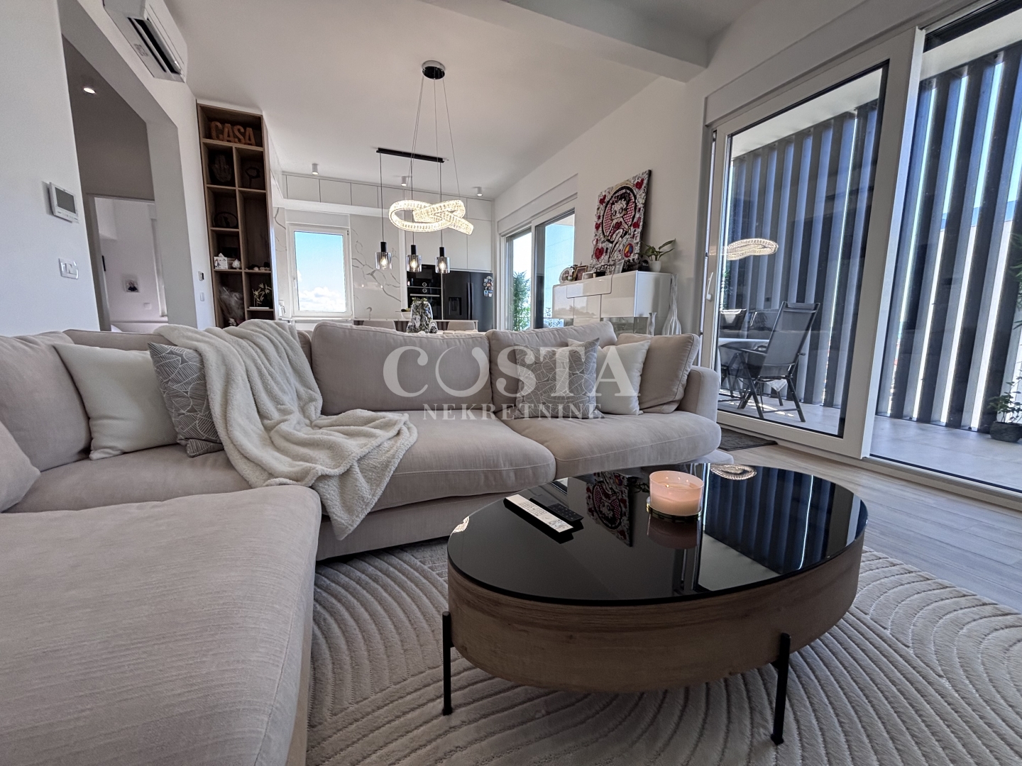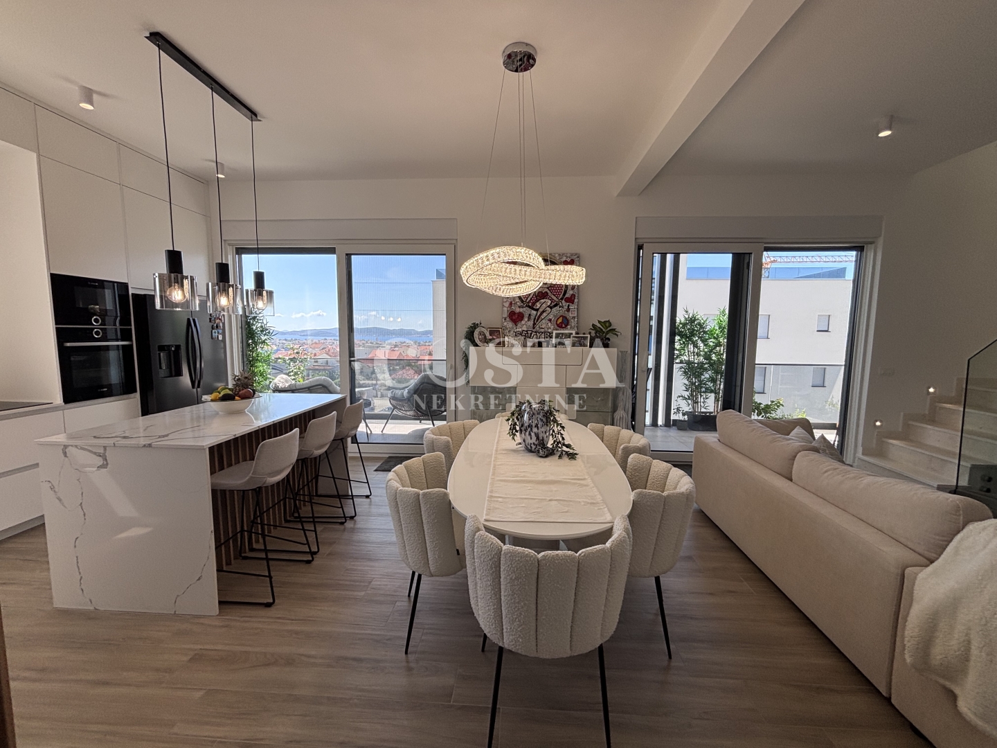 Dugoročan najam namještenog penthousea na Vidikovcu u Zadru. Ovaj luksuzno namješten stan smješten je na trećem katu stambene zgrade s liftom. Stambene površine 118,82 m2 ovaj kompletno klimatizirani stan u kojem je provedeno i podno grijanje, sastoji se od dnevnog boravka, kuhinje i blagovaone, dvije spavaće sobe, dvije kupaone, lođe i terase.