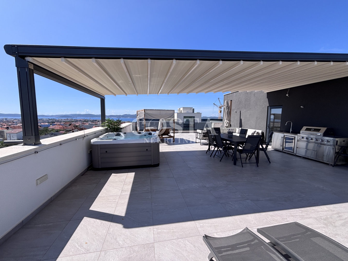 Stanu pripada i prostrana krovna terasa od 112,66 m2 na kojoj se nalazi jacuzzi, nadstrešnica i sunčalište. S terase se pruža impresivan panoramski pogled na grad i arhipelag. Stanu također pripadaju dva natkrivena parkirna mjesta, pa je sveukupna korisna vrijednost površine stana zajedno sa svim pripacima 153,95 m2.